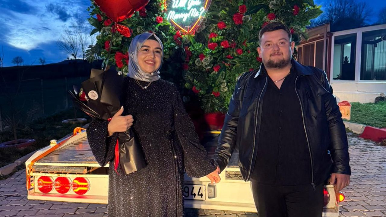 Mudurnu ilçesinde oto kurtarıcı olan Tolga Efe, bir süredir birlikte olduğu kız arkadaşı Emine Rana'ya sürpriz evlilik teklifi hazırladı. Efe, kendisine ait oto kurtarıcının üzerine devasa boyutlarda bir çiçek buketi yerleştirdi. Kız arkadaşının karşısına çıkan Efe, dev çiçek buketi eşliğinde evlilik teklifinde bulundu. Emine Rana sevgilisinin teklifine, 'Evet' cevabını verdi. (DHA)