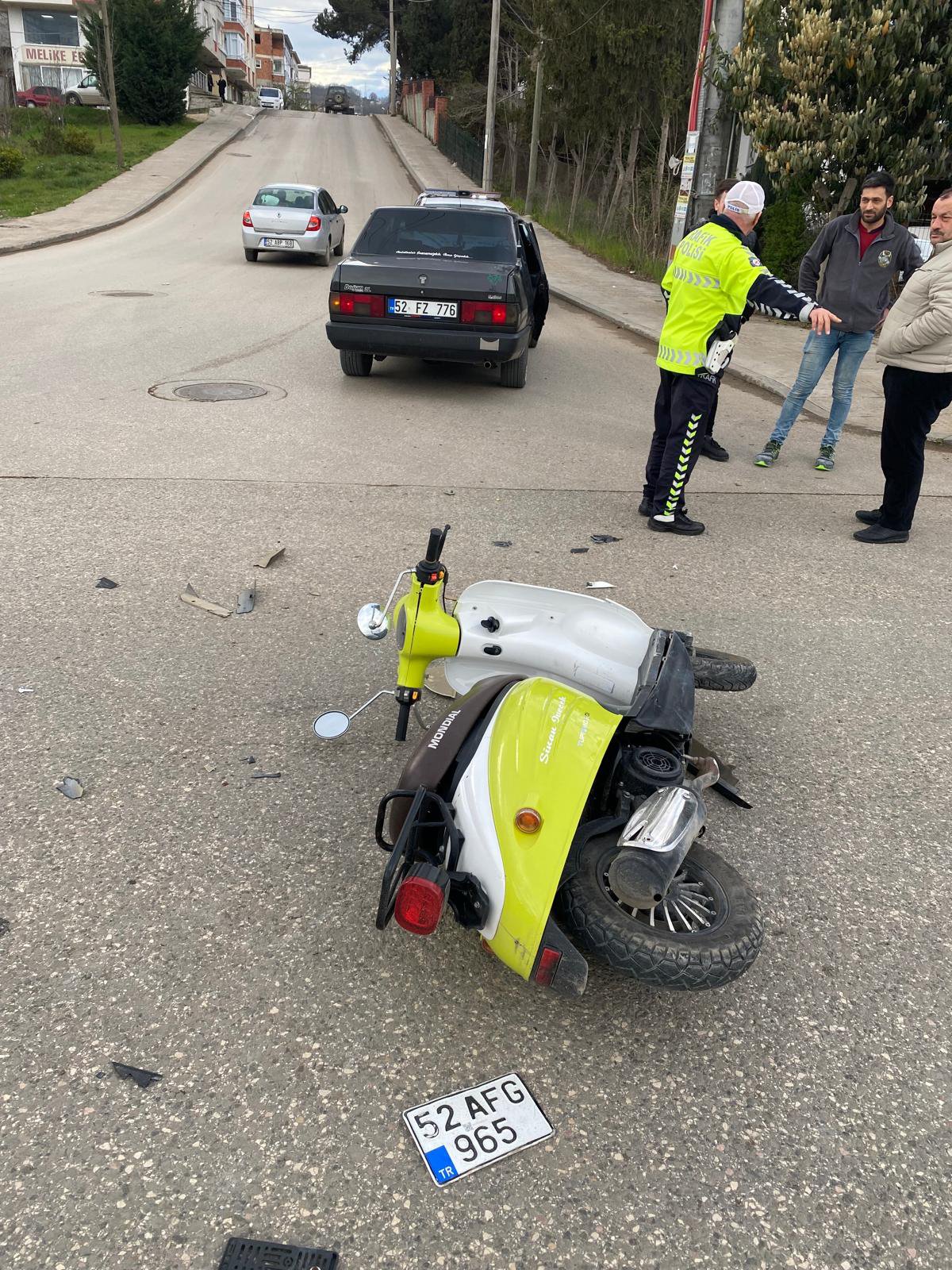 Kaza, saat 18.00 sıralarında Evkaf Mahallesi Kumru yolu üzerinde meydana geldi. Fırat Eskici (24) idaresindeki 52 FZ 776 plakalı otomobil, sokağa dönüş yaptığı sırada karşı yönden gelen Sinan İvecek (18) yönetimindeki 52 AFG 965 plakalı motosikletle çarpıştı. Kazada motosiklet sürücüsü Sinan İvecek ile otomobil sürücüsü Fırat Eskici ile yanında bulunan Nurcan Eskici (50) ve Pınar Kargün (29) yaralandı. İhbar üzerine bölgeye sağlık ve polis ekipleri sevk edildi. Yaralılar ilk müdahalelerinin ardından ambulanslarla hastaneye kaldırılarak tedavi altına alındı. Kazayla ilgili soruşturma sürüyor. (DHA)