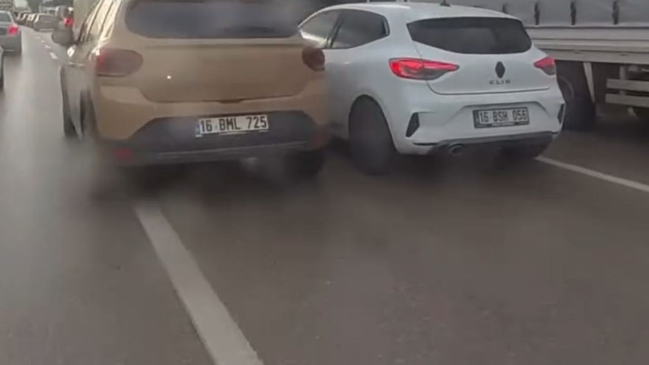 Osmangazi ilçesi Ankara Yolu'ndan kent merkezi istikametine seyir halinde olan iki otomobilin sürücüsü, bir anda araçlarıyla aynı şeride geçti. Sürücüler, araçlarını birbirlerinin üzerine sürerek trafiği tehlikeye attı. Aynı şeridi paylaşmaya çalışan sürücülerin 'şerit' kavgası, arkadan gelen bir motosiklet sürücüsünün kask kamerasına yansıdı. (DHA)