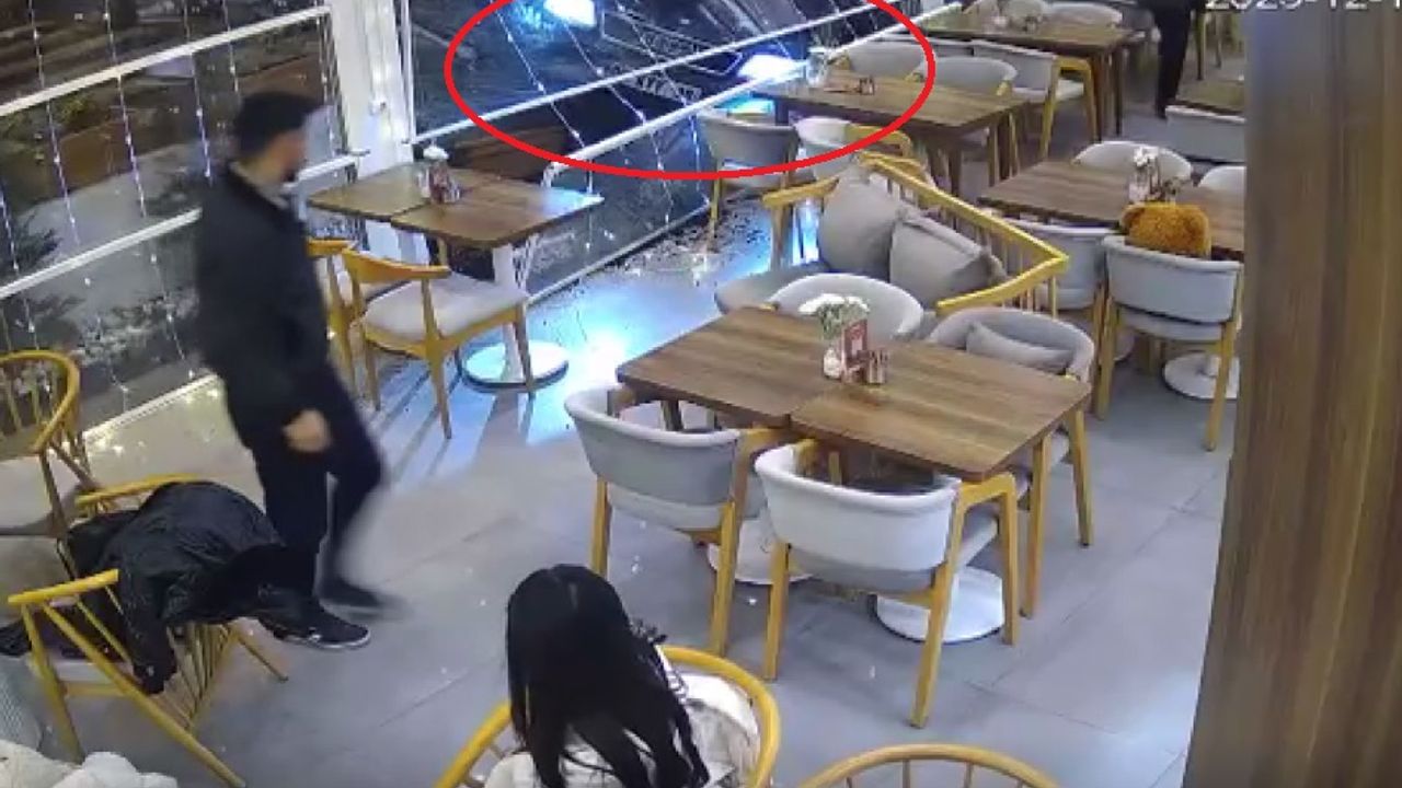 Öte yandan kaza, iş yerinin güvenlik kamerasına yansıdı. Görüntülerde otomobilin kafeye girdiği ve oturmak üzere olan 2 kişinin kazayı son anda atlattıkları görüldü.