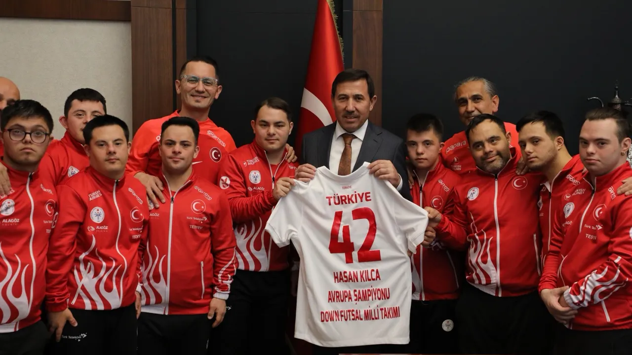 Türkiye Down Sendromlu Futsal Milli Takımı, Karatay Belediye Başkanı Hasan Kılca’yı makamında ziyaret etti.KONYA (İGFA) - Konya'nın Karatay ilçesinde samimi ortamda gerçekleşen buluşmada özel sporcular hem başarılarını paylaştı hem de Karatay Belediye Başkanı Hasan Kılca’ya spora verdiği desteklerden dolayı teşekkür etti.