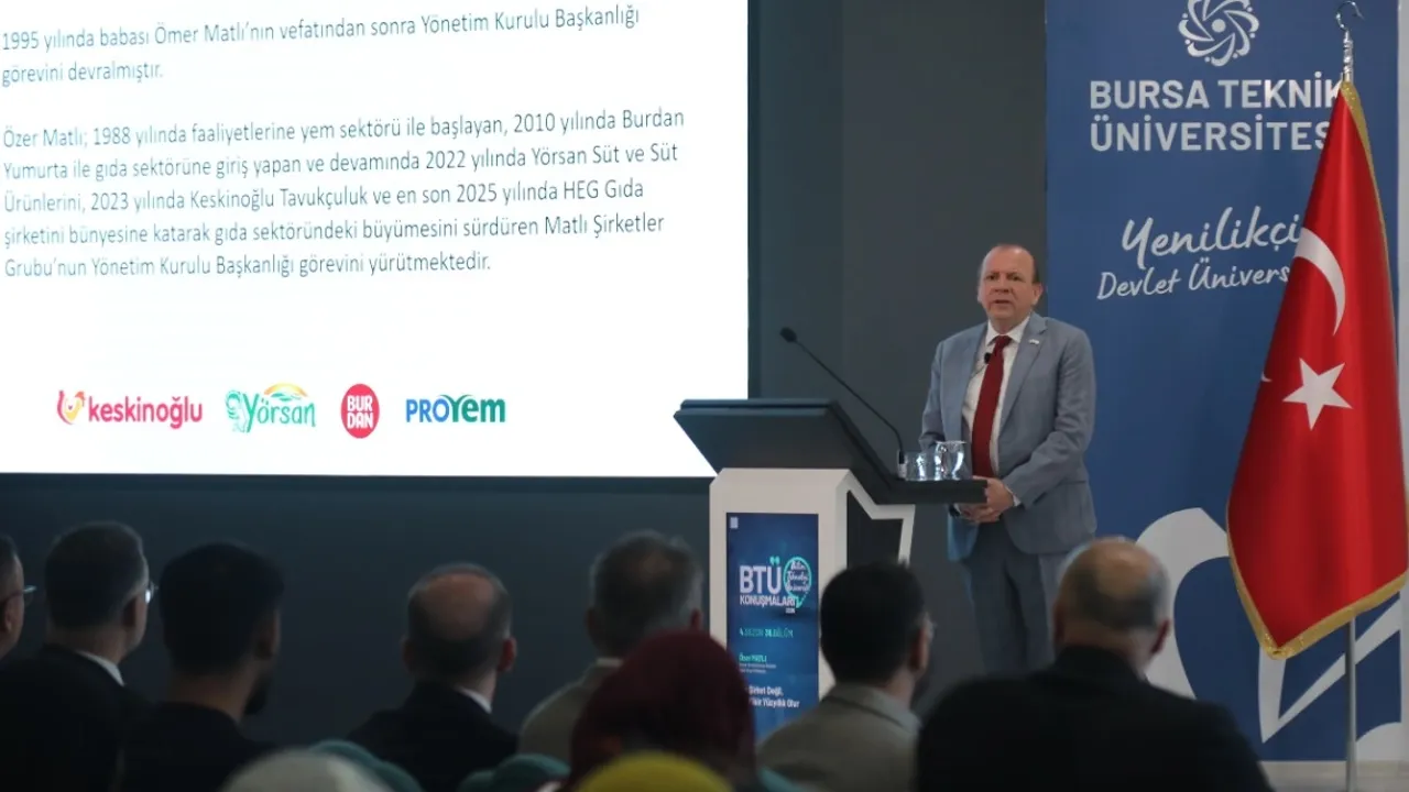 BTÜ Konuşmaları’nın bu haftaki konuğu Matlı Şirketler Grubu Başkanı Özer Matlı, “Her biriniz kendi alanızda başarı hikâyesi yazacaksınız. Dünya ve ülke, siz gençlerimizle gelişecek ve değişecektir. Ancak buna öncülük ederken unutmamanız gereken en önemli şey; toplumsal değerlerimizdir” dedi.BURSA (İGFA) - Bursa Teknik Üniversitesinde her hafta çarşamba günü düzenlenen BTÜ Konuşmaları’nın 4. sezon 36’cı bölüm konuğu, Matlı Şirketler Grubu Yönetim Kurulu Başkanı ve aynı zamanda Bursa Ticaret Borsası Yönetim Kurulu Başkanı Özer Matlı oldu.
