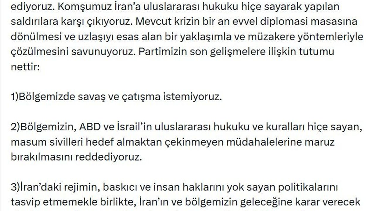 CHP Genel Başkanı Özgür Özel, sanal medya hesabından yaptığı açıklamada, 'ABD ve İsrail'in İran'a saldırmasıyla başlayan süreci yakından takip ediyoruz. Komşumuz İran'a uluslararası hukuku hiçe sayarak yapılan saldırılara karşı çıkıyoruz. Mevcut krizin bir an evvel diplomasi masasına dönülmesi ve uzlaşıyı esas alan bir yaklaşımla ve müzakere yöntemleriyle çözülmesini savunuyoruz. Partimizin son gelişmelere ilişkin tutumu nettir; bölgemizde savaş ve çatışma istemiyoruz. Bölgemizin, ABD ve İsrail'in uluslararası hukuku ve kuralları hiçe sayan, masum sivilleri hedef almaktan çekinmeyen müdahalelerine maruz bırakılmasını reddediyoruz. İran'daki rejimin, baskıcı ve insan haklarını yok sayan politikalarını tasvip etmemekle birlikte, İran'ın ve bölgemizin geleceğine karar verecek olanların, sadece ve sadece burada yaşayanlar olduğunun altını çiziyoruz. Bölgemizin huzuru ve güvenliği, ülkemiz için hayati öneme sahiptir. Burayı istikrarsızlaştıracak her türlü girişimin karşısındayız' ifadelerini kullandı.