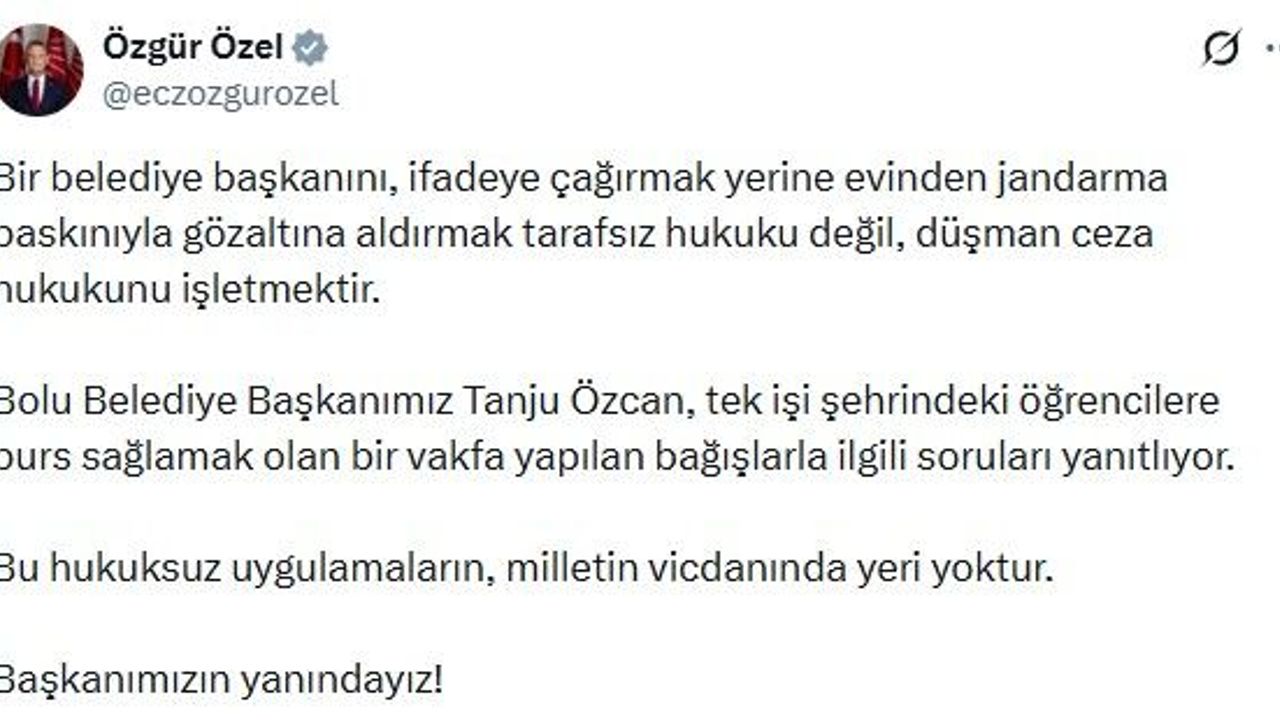 Özgür Özel, sanal medya hesabından yaptığı paylaşımda, 'Bir belediye başkanını, ifadeye çağırmak yerine evinden jandarma baskınıyla gözaltına aldırmak tarafsız hukuku değil, düşman ceza hukukunu işletmektir. Bolu Belediye Başkanımız Tanju Özcan, tek işi şehrindeki öğrencilere burs sağlamak olan bir vakfa yapılan bağışlarla ilgili soruları yanıtlıyor. Bu hukuksuz uygulamaların, milletin vicdanında yeri yoktur. Başkanımızın yanındayız' ifadelerini kullandı. (DHA)