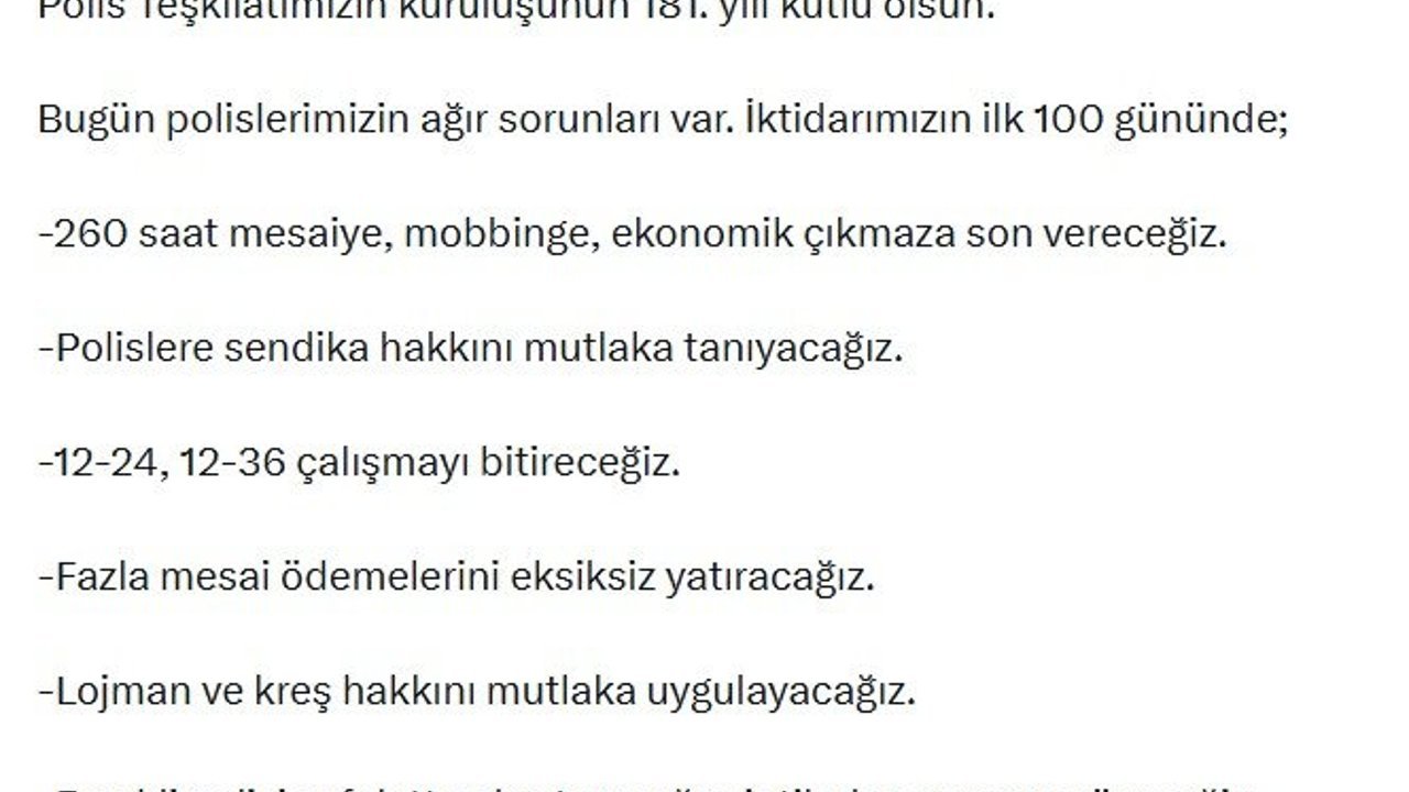 Özel, sanal medya hesabından yaptığı paylaşımda, 'Milletimizin huzuru ve güvenliği için büyük bir sorumluluk üstlenen Türk Polis Teşkilatımızın kuruluşunun 181'inci yılı kutlu olsun. Bugün polislerimizin ağır sorunları var. İktidarımızın ilk 100 gününde; 260 saat mesaiye, mobbinge, ekonomik çıkmaza son vereceğiz. Polislere sendika hakkını mutlaka tanıyacağız. 12-24, 12-36 çalışmayı bitireceğiz. Fazla mesai ödemelerini eksiksiz yatıracağız. Lojman ve kreş hakkını mutlaka uygulayacağız. Emekli polisi sefaletten kurtaracağız, intibak sorununu çözeceğiz. Görevi başında olan tüm emniyet mensuplarımıza kolaylıklar diliyor, şehitlerimizi rahmet, gazilerimizi minnetle anıyorum' ifadelerini kullandı. (DHA)