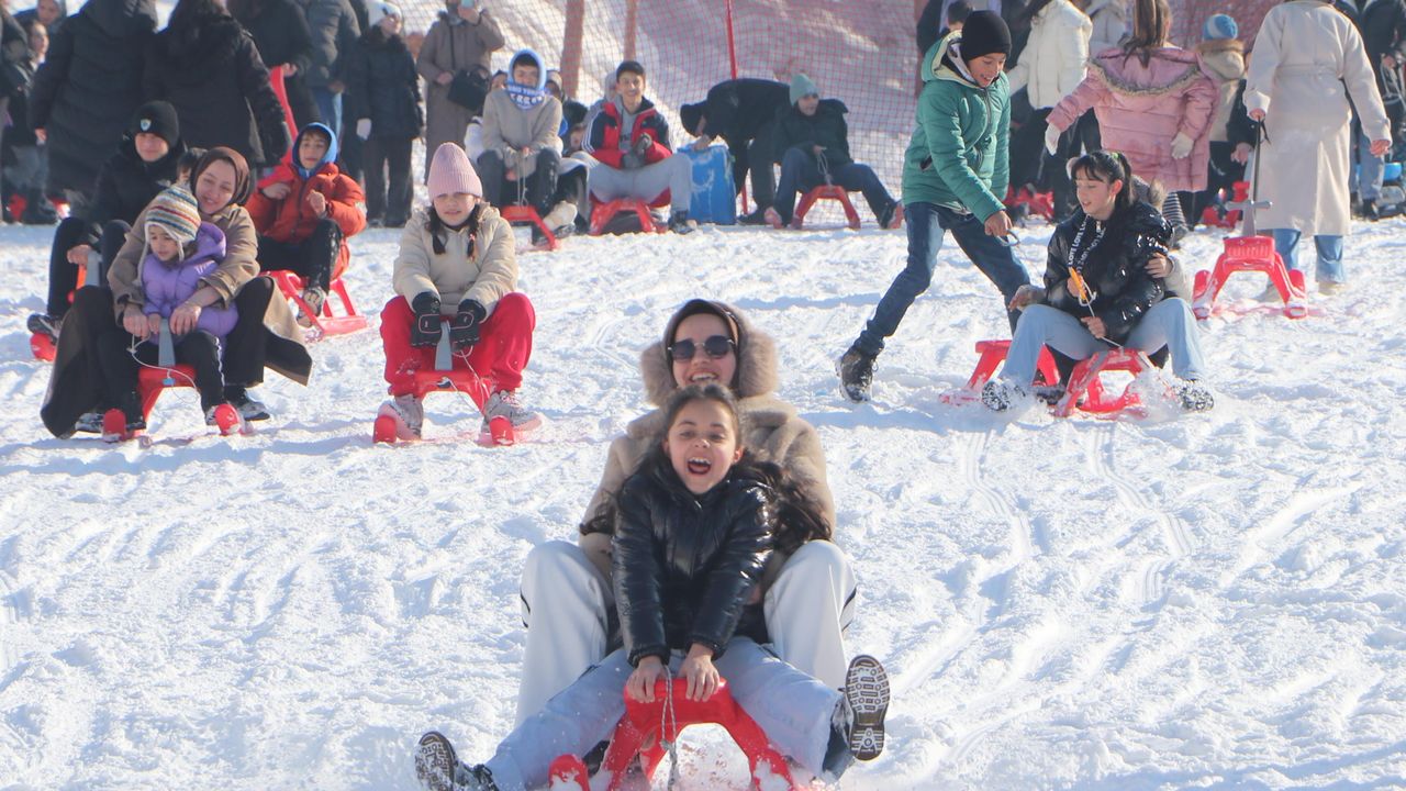 Salih TEKİN/ERZURUM, (DHA)- TÜRKİYE'nin önemli kayak merkezlerinden Palandöken'de, sömestir yoğunluğu yaşanıyor. Tatil için 3 bin 176 metre yükseklikteki Palandöken'e gelen çocukların bazıları kayak öğrenirken, bazıları da kızaklarla pistte kayıyor.