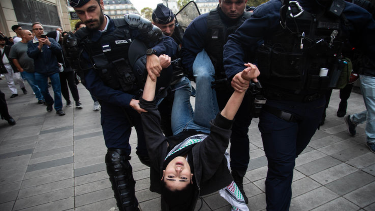 Fransa'nın başkenti Paris'te polis, Filistin'e destek için kent meydanında ve sokaklarda bir araya gelenlerin etrafını sararak fiziki müdahalede bulundu ve göstericileri göz yaşartıcı gazla dağıtmaya çalıştı.Paris'te emniyet müdürlüğünün yasağına rağmen Filistin'e destek gösterisi düzenlendi.Gösteri, başkentin ünlü Cumhuriyet Meydanı'nda yerel saatle 15.00 sularında başladı.Gösteri başladığında polis meydanı tahliye ederek gösteriyi dağıtmaya çalıştı.Aralarında engelli vatandaşlar ve çok sayıda kadının olduğu göstericiler meydana yakın ara sokakta eylemlerine devam etti.Corbeil-Essonnes Belediye Başkan Yardımcısı Elsa Toure protestoya katılan tek Fransız "seçilmiş" oldu.