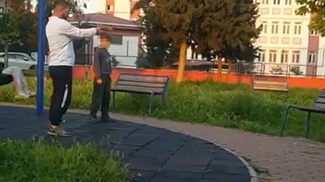 Yusuf YILDIZ/ADANA, (DHA)-ADANA'da geldikleri parkta oyuncak silahla atış talimi yapan çocuk ile onu yönlendiren kişi, cep telefonu kamerasına yansıdı.