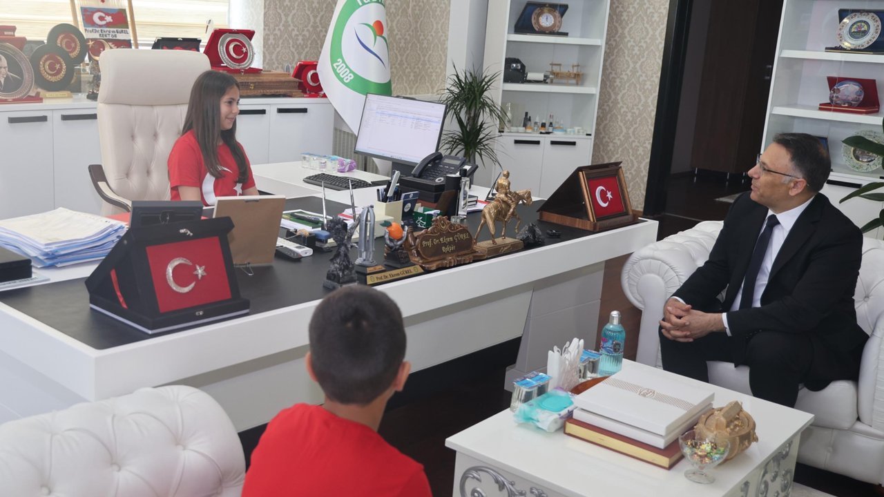 Iğdır Üniversitesi Rektörü Prof. Dr. Ekrem Gürel, 23 Nisan Ulusal Egemenlik ve Çocuk Bayramı kutlamaları kapsamında koltuğunu Melekli Atatürk İlköğretim Okulu 4-A sınıfı öğrencileri Defne Miray Çatalkaya ve Poyraz Varol'a devretti. Misafirlerini kapıda karşılayan Rektör Gürel, koltuğunu çocuklara teslim edip, onlarla gelecek hedefleriyle ilgili sohbet etti. Rektörlük koltuğunda oturan Defne Miray Çatalkaya, kendisine bu fırsatı sunan üniversite yönetimine teşekkür edip, bayramın mutluluğunu yaşadığını dile getirdi. Görevlerini ciddiyetle yapan öğrenciler, üniversiteyle ilgili sohbetin ardından etkinliği son dönemde ilgi gören Kartal Dansı ile sonlandırdı. Öğrencilerin gösterisini izleyen ve onlara eşlik eden Prof. Dr. Gürel, çocukları tebrik ederek çeşitli hediyeler verdi. (DHA)