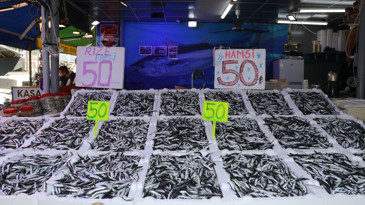 RİZE (AA) - Rize'de balıkçı tezgahlarında hamsinin kilogramı 50 liradan satışa sunuluyor.