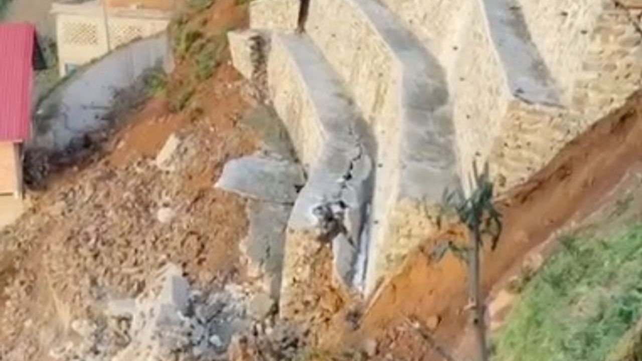 Adem AKATİN/ ARDEŞEN(Rize),(DHA)- RİZE'nin Ardeşen ilçesi Bayırcık köyünde yamaçta yapımı süren istinat duvarı heyelan nedeniyle çöktü. Yamaçtan akan toprak ve irili ufaklı kaya parçaları köy yolunu ulaşıma kapattı. Heyelan anı cep telefonu kamerasına yansıdı.