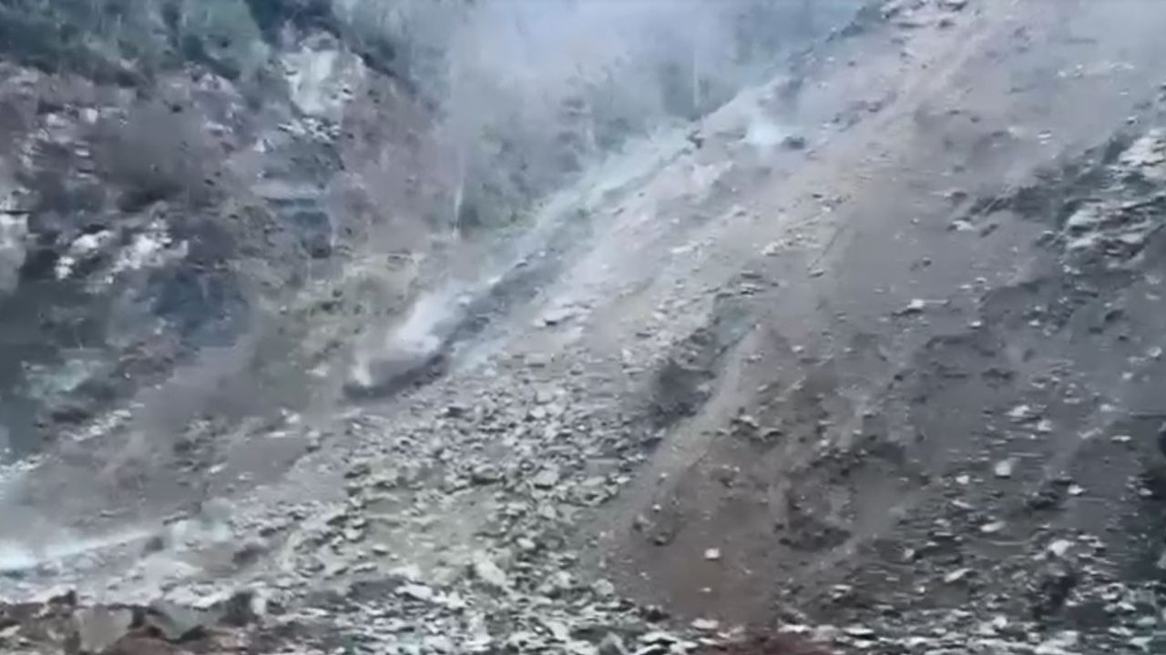 Mehmet Can PEÇE/ ÇAYELİ(Rize), (DHA)- RİZE'nin Çayeli ilçesinde meydana gelen heyelanda yamaçtan kopan taş ve toprak yığını nedeniyle köy yolu ulaşıma kapandı. Heyelan anı cep telefonu kamerasıyla görüntülendi.