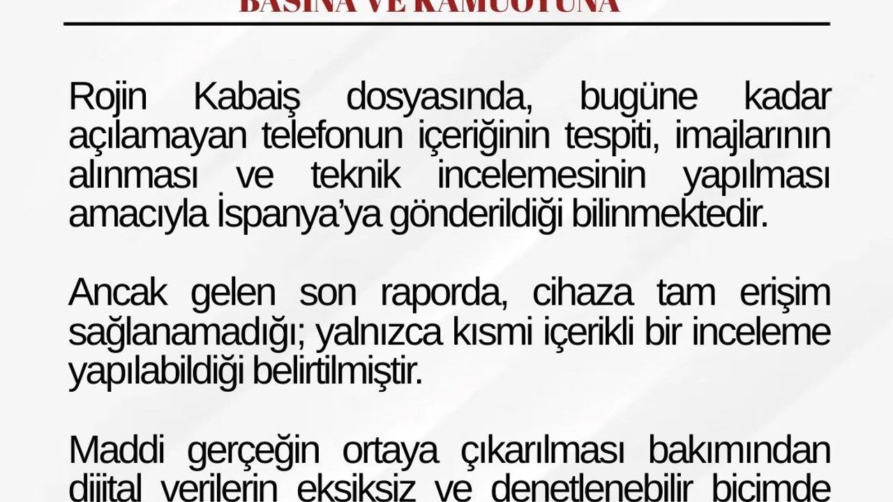 Van Baro Başkanlığı, Rojin'in incelemeye gönderilen cep telefonuna ilişkin açıklama yaptı. Açıklamada, 'Rojin Kabaiş dosyasında, bugüne kadar açılamayan cep telefonunun içeriğinin tespiti, imajlarının alınması ve teknik incelemesinin yapılması amacıyla İspanya'ya gönderildiği bilinmektedir. Ancak gelen son raporda, cihaza tam erişim sağlanamadığı, yalnızca kısmi içerikli bir inceleme yapılabildiği belirtilmiştir. Maddi gerçeğin ortaya çıkarılması bakımından dijital verilerin eksiksiz ve denetilebilir biçimde incelenmesi büyük önem taşımaktadır. Sürecin şeffaf ve etkin bir biçimde yürütebilmesinin takipçisi olduğumuzu ve olacağımızı kamuoyuna saygıyla bildiririz.' denildi. (DHA)