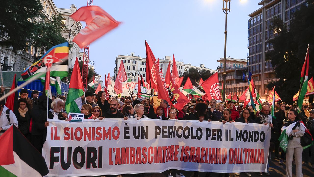 Göstericiler, 'Siyonizm dünya için tehlikelidir. İsrail Büyükelçisi, İtalya'dan gönderilsin' yazılı pankart açtı.