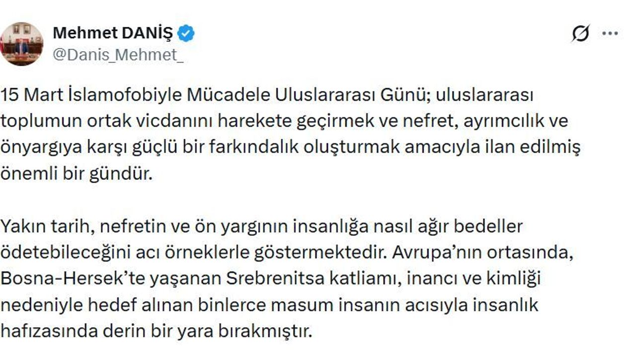 RTÜK Başkanı Daniş, '15 Mart Uluslararası İslamofobi ile Mücadele Günü' dolayısıyla sanal medya hesabından açıklama yaptı. Daniş, '15 Mart İslamofobi ile Mücadele Uluslararası Günü; uluslararası toplumun ortak vicdanını harekete geçirmek ve nefret, ayrımcılık ve önyargıya karşı güçlü bir farkındalık oluşturmak amacıyla ilan edilmiş önemli bir gündür. Yakın tarih, nefretin ve önyargının insanlığa nasıl ağır bedeller ödetebileceğini acı örneklerle göstermektedir. Avrupa'nın ortasında, Bosna-Hersek'te yaşanan Srebrenitsa katliamı, inancı ve kimliği nedeniyle hedef alınan binlerce masum insanın acısıyla insanlık hafızasında derin bir yara bırakmıştır' dedi.