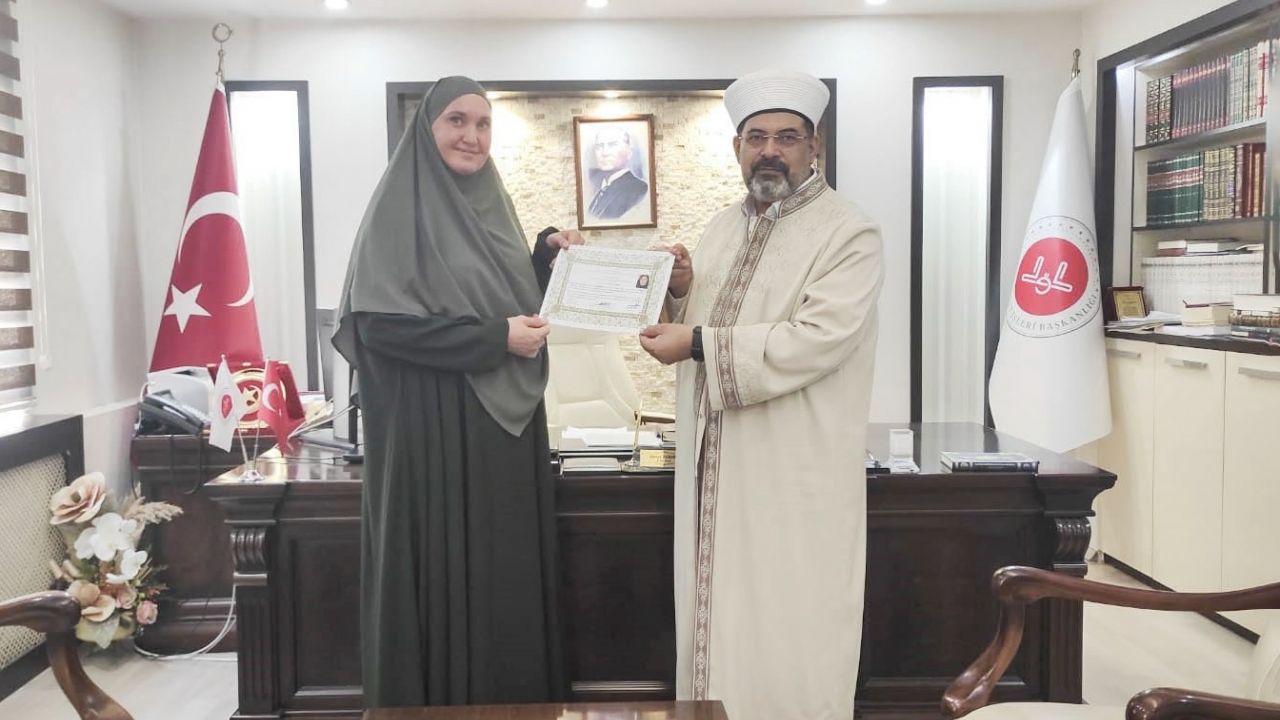 İl Müftülüğünde düzenlenen ihtida merasiminde İl Müftüsü Ahmet Durmuş, Natalia'ya İslam dininin inanç, ibadet ve ahlak esasları hakkında bilgi verdi.