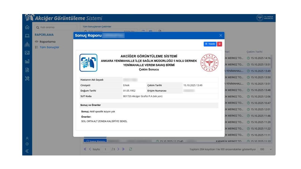 171 verem savaş dispanserini bu sisteme entegre ettiklerini belirten Genel Müdür Sezer, 'Projenin hayata geçirildiği günden bu yana yaklaşık 8 bin akciğer grafisi sisteme kaydedildi. Ülke genelindeki dispanserlerimizde elde edilen akciğer görüntülerini tek bir ulusal altyapı üzerinde topluyor, güvenli biçimde arşivliyoruz. Bu görüntüler gerektiğinde hekimlerimiz tarafından uzaktan değerlendirilebiliyor. Böylece hem tanı süreçlerinde standartlaşmayı sağlıyoruz hem de hastalık verilerini bölgesel ve ulusal ölçekte anlık olarak izleyebiliyoruz. Yeni kurduğumuz sistemle; görüntülerin tüm merkezlerden erişilebilir hale getirilmesi ile tanı ve tedavi süreçlerini hızlandırdık ve süreçlerin dijital hale getirilmesi sayesinde çok önemli kazanımlar elde ettik' ifadelerini kullandı. (DHA)