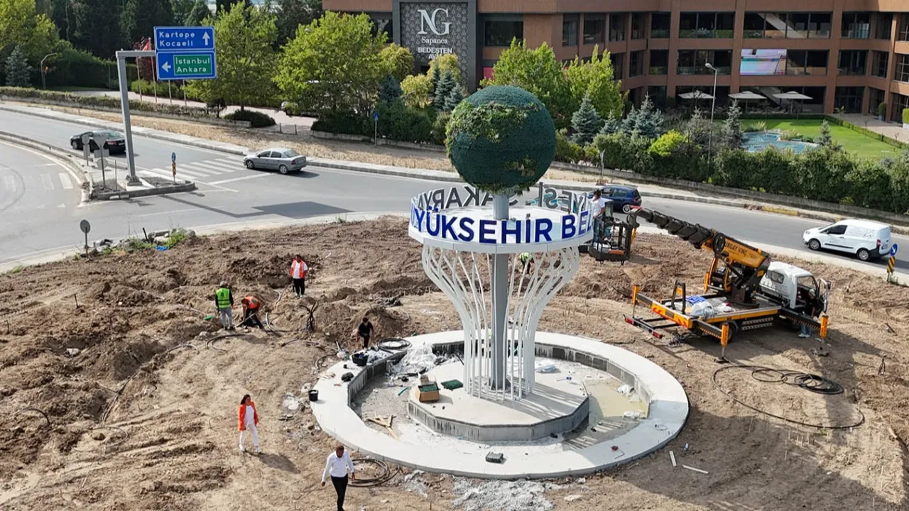 Kavşağın yeşil alanları, özel formlu bitkilerle sanatsal bir düzen içinde şekillendiriliyor. Doğal dokuya uyumlu proje, ilçeye görsel bir zenginlik katacak. Merkezinde yer alan kuru havuz sistemi inşası tamamlanan kavşak, Sapanca’nın yeşilini, doğasını ve tabiat güzelliğini temsil eden ‘yeşil dünya’ figürüyle estetik kazandı.