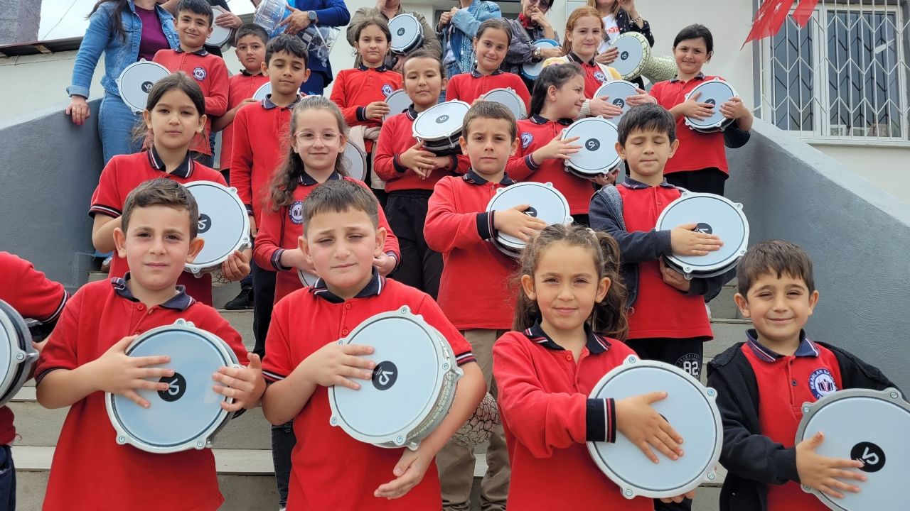 Okulun müzik atölyesine bağışlanan 22 darbuka, gönüllüler tarafından okulda öğrencilere teslim edildi.