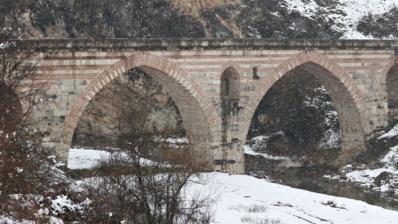 Karayolları Genel Müdürlüğü tarafından 2008 yılında restore edilerek araç trafiğine kapatılan Kurt Köprü, bölgede etkili olan kar yağışıyla beyaza büründü.