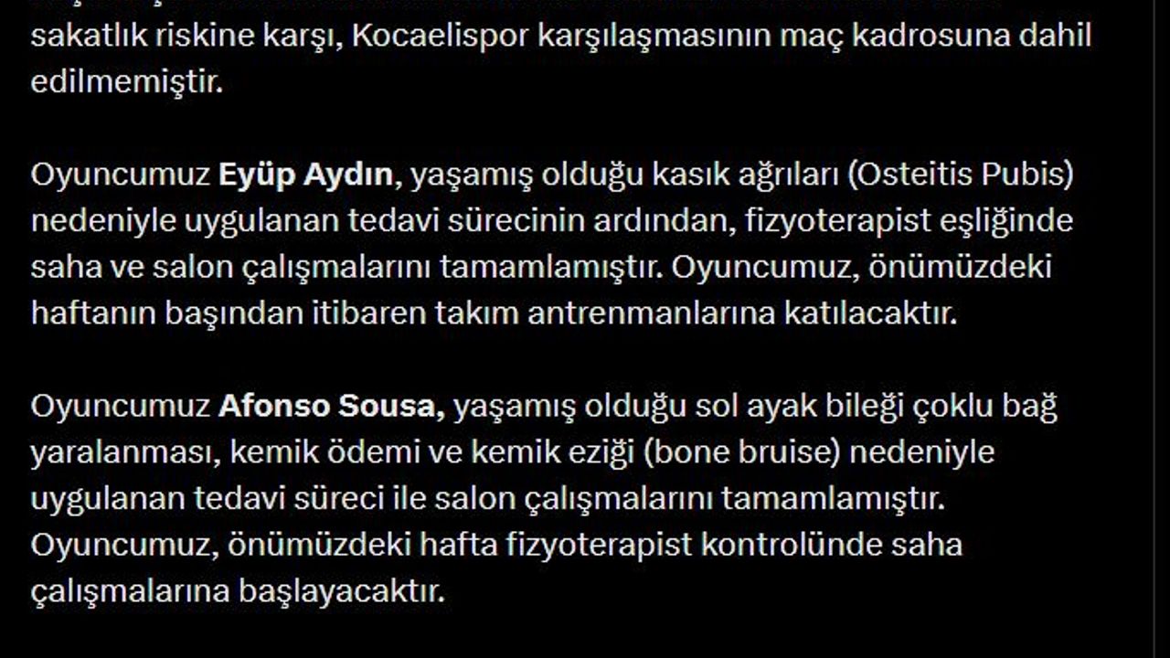Kırmızı-beyazlı takım tarafından yapılan sakatlık açıklamasında, 'Oyuncumuz Carlo Holse, geçirmiş olduğu sindirim sistemi enfeksiyonu (akut gastroenterit) sonrasında takım antrenmanlarına kısmen katılmaya başlamıştır. Ancak fiziki olarak henüz tam hazır olmaması ve olası sakatlık riskine karşı, Kocaelispor karşılaşmasının maç kadrosuna dahil edilmemiştir. Oyuncumuz Eyüp Aydın, yaşamış olduğu kasık ağrıları (Osteitis Pubis) nedeniyle uygulanan tedavi sürecinin ardından, fizyoterapist eşliğinde saha ve salon çalışmalarını tamamlamıştır. Oyuncumuz, önümüzdeki haftanın başından itibaren takım antrenmanlarına katılacaktır. Oyuncumuz Afonso Sousa, yaşamış olduğu sol ayak bileği çoklu bağ yaralanması, kemik ödemi ve kemik eziği (bone bruise) nedeniyle uygulanan tedavi süreci ile salon çalışmalarını tamamlamıştır. Oyuncumuz, önümüzdeki hafta fizyoterapist kontrolünde saha çalışmalarına başlayacaktır. Oyuncumuz Tanguy Coulibaly, antrenman sırasında sol dizine aldığı darbe sonrası, daha önce tedavisi devam eden sakatlık bölgesinde ağrı ve hassasiyet hissetmiştir. İleri tetkik ve görüntüleme işlemleri için İstanbul'da bulunan sponsor hastanemize yönlendirilmiştir. Oyuncumuzun sağlık durumuyla alakalı detaylı bilgilendirme, kontrollerin tamamlanmasının ardından kamuoyu ile paylaşılacaktır' ifadelerine yer verildi. (DHA)