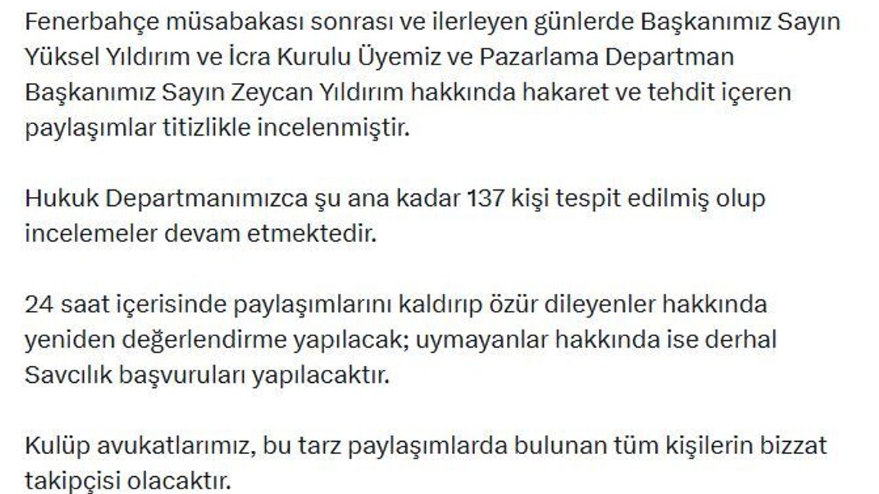 'Fenerbahçe müsabakası sonrası ve ilerleyen günlerde Başkanımız Yüksel Yıldırım ve İcra Kurulu Üyemiz ve Pazarlama Departman Başkanımız Zeycan Yıldırım hakkında hakaret ve tehdit içeren paylaşımlar titizlikle incelenmiştir. Hukuk Departmanımızca şu ana kadar 137 kişi tespit edilmiş olup incelemeler devam etmektedir. 24 saat içerisinde paylaşımlarını kaldırıp özür dileyenler hakkında yeniden değerlendirme yapılacak; uymayanlar hakkında ise derhal savcılık başvuruları yapılacaktır. Kulüp avukatlarımız, bu tarz paylaşımlarda bulunan tüm kişilerin bizzat takipçisi olacaktır.' (DHA)