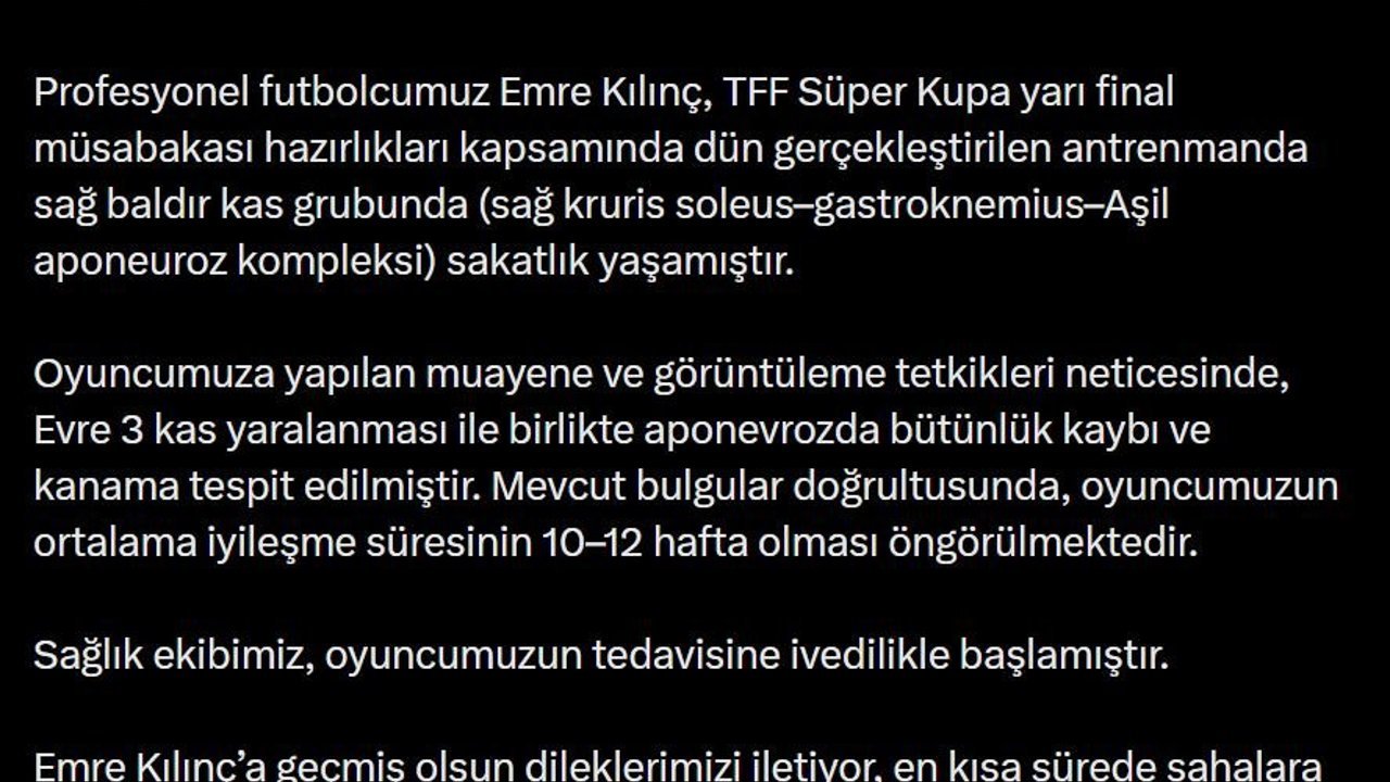Kırmızı-beyazlı kulüpten yapılan açıklamada, Emre Kılınç'ın TFF Süper Kupa yarı final müsabakası hazırlıkları kapsamında dün gerçekleştirilen antrenmanda sağ baldır kas grubundan sakatlandığını, oyuncunun 10-12 hafta sahalardan uzak kalacağının öngörüldüğü ifade edildi. Kulübün sanal medya hesaplarından yapılan açıklamada, 'Profesyonel futbolcumuz Emre Kılınç, TFF Süper Kupa yarı final müsabakası hazırlıkları kapsamında dün gerçekleştirilen antrenmanda sağ baldır kas grubunda (sağ kruris soleus-gastroknemius-Aşil aponeuroz kompleksi) sakatlık yaşamıştır. Oyuncumuza yapılan muayene ve görüntüleme tetkikleri neticesinde, Evre 3 kas yaralanması ile birlikte aponevrozda bütünlük kaybı ve kanama tespit edilmiştir. Mevcut bulgular doğrultusunda, oyuncumuzun ortalama iyileşme süresinin 10-12 hafta olması öngörülmektedir. Sağlık ekibimiz, oyuncumuzun tedavisine ivedilikle başlamıştır. Emre Kılınç'a geçmiş olsun dileklerimizi iletiyor, en kısa sürede sahalara dönmesini temenni ediyoruz' ifadelerine yer verildi. (DHA)