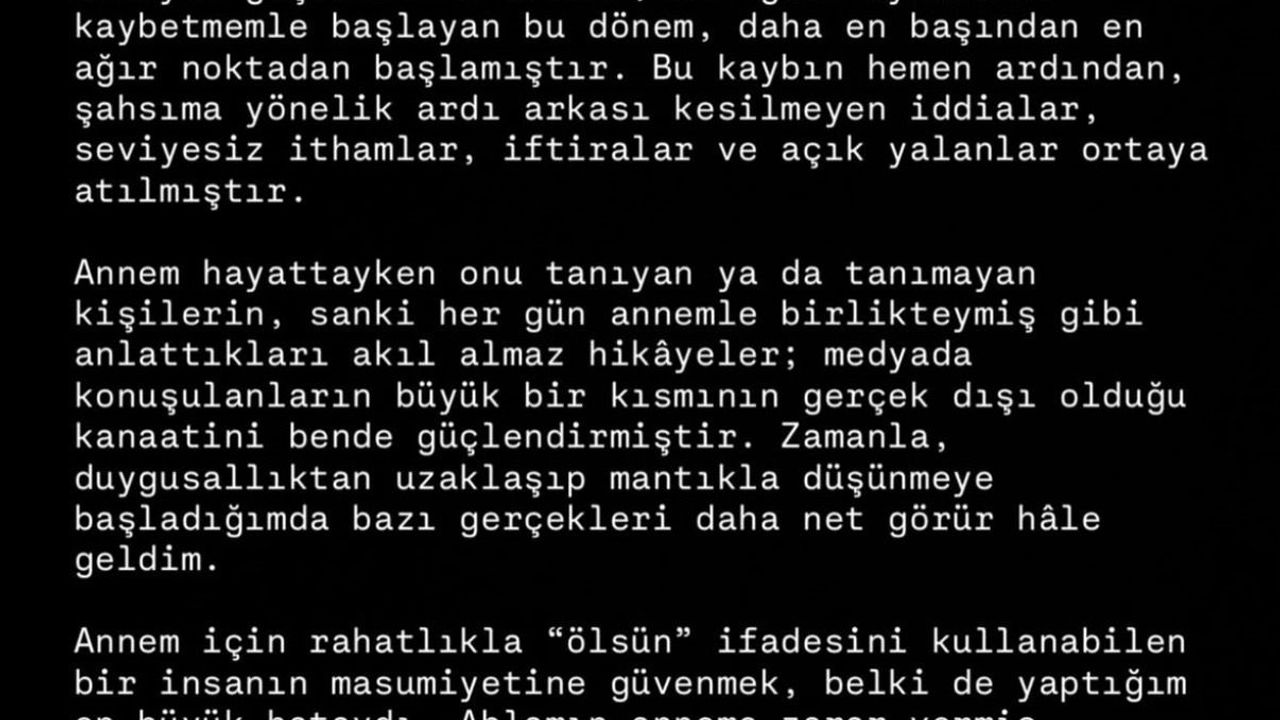 Yaşadığı sürecin hayatının en zor dönemi olduğunu belirten Gülter, açıklamasında ablasının masumiyetine güvenmesinin bir hata olduğunu belirterek, 'Yaşadığım bu süreç, hayatımın açık ara en zor günleri ve ayları olmuştur. Ne geçmişte kalmıştır ne de kolayca geçecektir. Annemi, bir gece uykusunda kaybetmemle başlayan bu dönem, daha en başından en ağır noktadan başlamıştır. Bu kaybın hemen ardından, şahsıma yönelik ardı arkası kesilmeyen iddialar, seviyesiz ithamlar, iftiralar ve açık yalanlar ortaya atılmıştır. Annem hayattayken onu tanıyan ya da tanımayan kişilerin, sanki her gün annemle birlikteymiş gibi anlattıkları akıl almaz hikâyeler; medyada konuşulanların büyük bir kısmının gerçek dışı olduğu kanaatini bende güçlendirmiştir. Zamanla, duygusallıktan uzaklaşıp mantıkla düşünmeye başladığımda bazı gerçekleri daha net görür hâle geldim. Annem için rahatlıkla 'ölsün' ifadesini kullanabilen bir insanın masumiyetine güvenmek, belki de yaptığım en büyük hataydı. Ablamın anneme zarar vermiş olabileceği ihtimalini düşünmek dahi benim için son derece ağırdır. Hâlâ aşabilmiş değilim. Hâlâ kabul etmek, sizin anlayamayacağınız kadar zordur. Buna rağmen, 'Bir annenin kızı annesine nasıl zarar verebilir?' düşüncesiyle bu ihtimali reddettim ve sustum. Hakkımda ortaya atılan iddiaların tamamı asılsız ve seviyesiz olduğu için uzun süre ciddiye almadım. Ancak bu süreç bana; çevremizde, annemin hayatında ve medyada ne kadar vicdansız, ne kadar ahlaksız insanların bulunabildiğini ve güvenerek izlediğimiz haberlerin ne denli yönlendirilebilir, yalan ve iftira içerebilir olduğunu açıkça göstermiştir' ifadelerini kullandı.