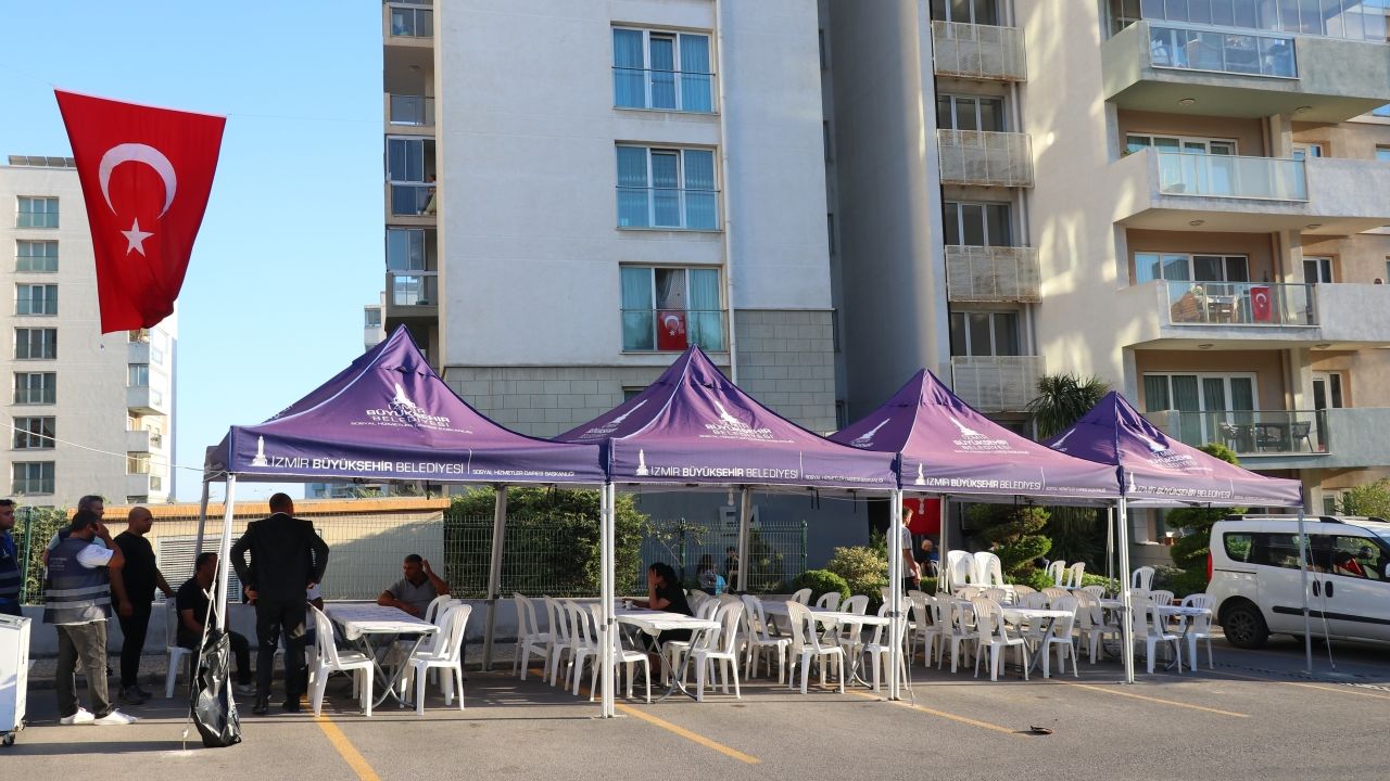 Apartmanın önüne belediye ekiplerince taziye çadırı kuruldu.