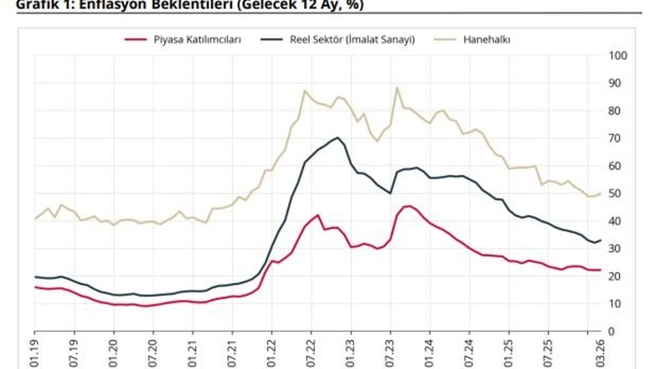TCMB, Mart 2026 dönemine ilişkin sektörel enflasyon beklentilerini açıkladı. Buna göre; 2026 yılı Mart ayında 12 ay sonrası yıllık enflasyon beklentileri bir önceki aya göre, piyasa katılımcıları için 0,07 puan artarak yüzde 22,17 seviyesine, reel sektör için 0,90 puan artarak yüzde 32,90 seviyesine, hanehalkı için 1,08 puan artarak yüzde 49,89 seviyesine yükseldi. Gelecek 12 aylık dönemde enflasyonun düşeceğini bekleyen hanehalkı oranı bir önceki aya göre 5,19 puan azalarak yüzde 15,14 seviyesinde gerçekleşti. (DHA)