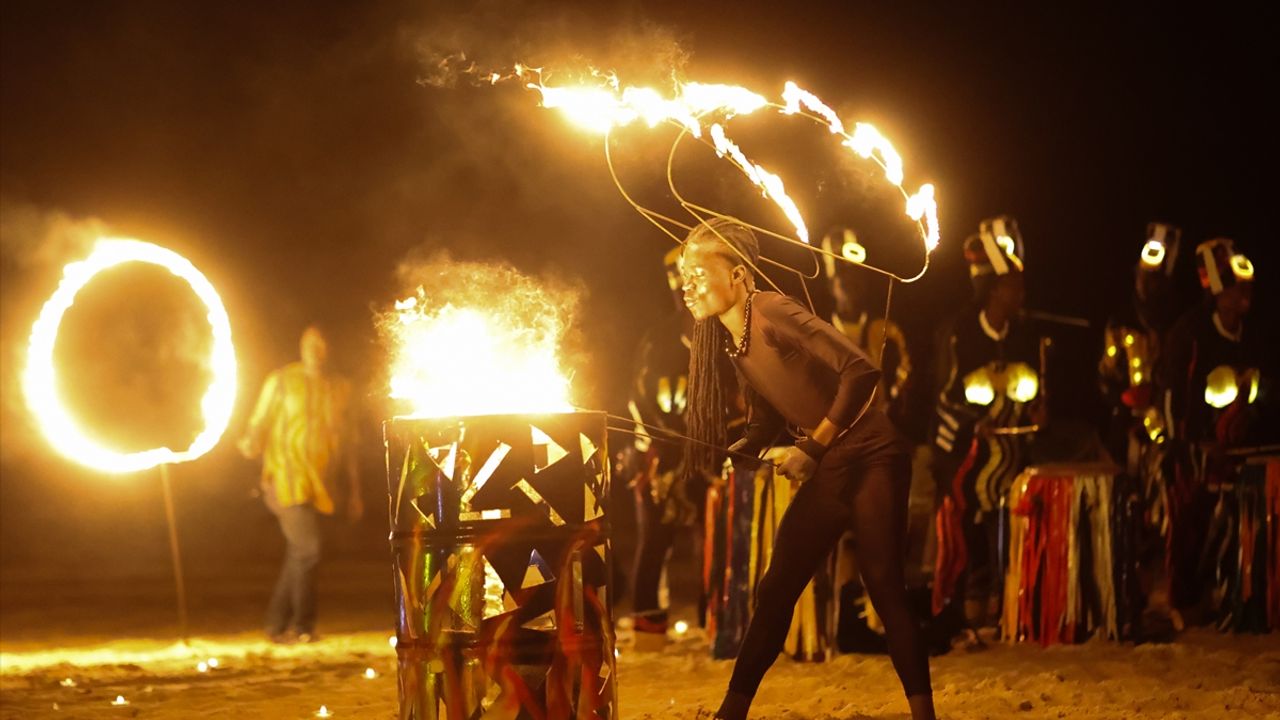 Dakar yakınlarında, Atlas Okyanusu kıyısında gece yarısı düzenlenen gösteride, geleneksel perküsyonlar çalan grup üyelerine ateş cambazları eşlik etti.