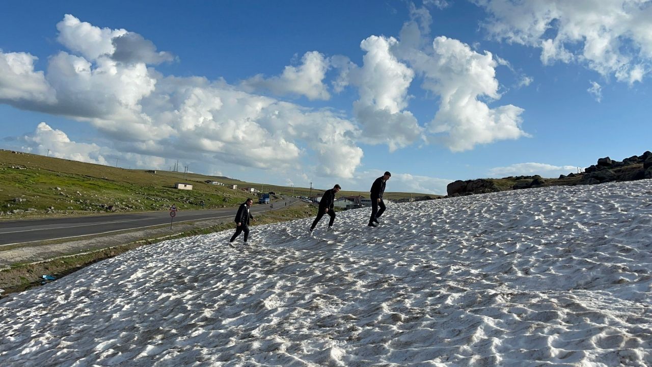 ARDAHAN (AA) - Sıcak havadan bunalanlar, Ardahan'daki karlı zirvelerde serinlemenin keyfini yaşıyor.