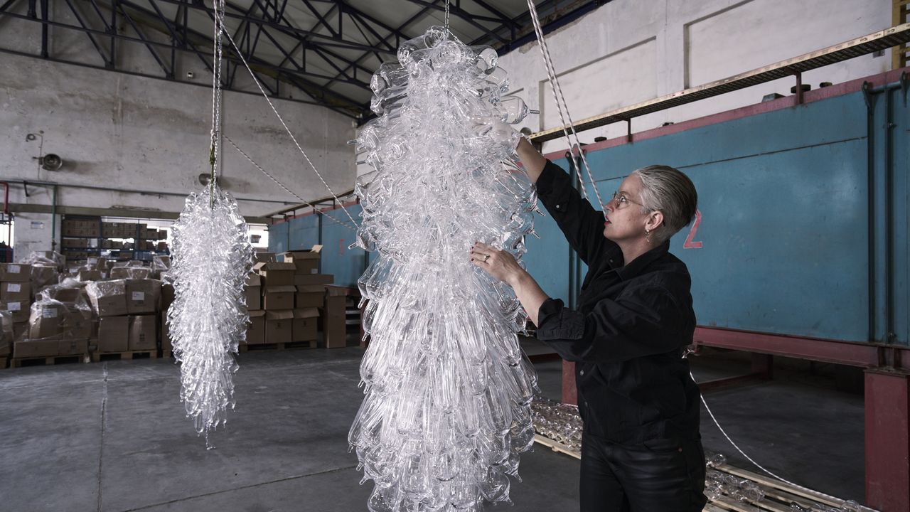 Şişecam'ın cam ustalarıyla yürütülen ortak üretim sürecinde, geleneksel kalıplar yerine sanatçının yönlendirmesiyle sıcak cam serbestçe şekillendirildi. Serbest üfleme tekniğiyle ortaya çıkan doğaçlama formlar, camın yalnızca endüstriyel bir malzeme değil, aynı zamanda güçlü bir sanat dili olduğunu gösterdi.