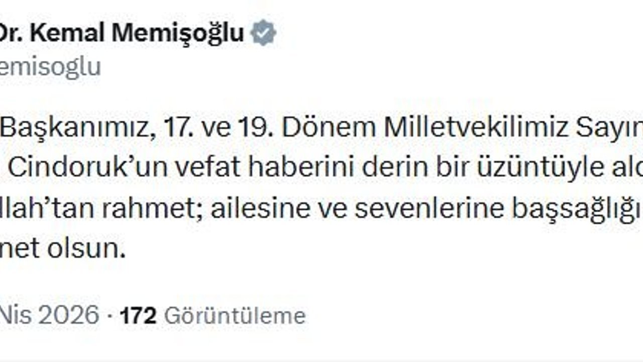 Sağlık Bakanı Kemal Memişoğlu da sanal medya paylaşımında, 'Eski TBMM Başkanımız, 17 ve 19'uncu dönem Milletvekilimiz Sayın Ahmet Hüsamettin Cindoruk'un vefat haberini derin bir üzüntüyle aldım. Merhuma Allah'tan rahmet; ailesine ve sevenlerine başsağlığı diliyorum. Mekanı cennet olsun' dedi. (DHA)