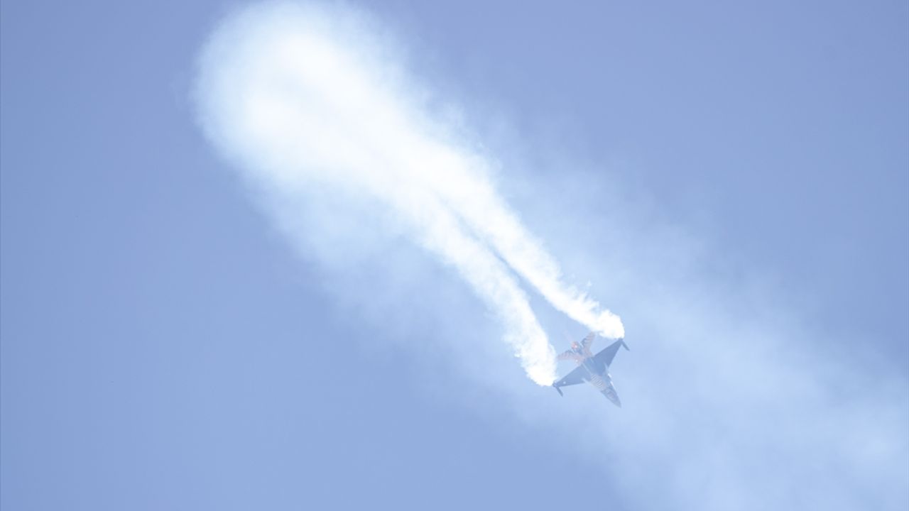 Prova uçuşunu izlemeye gelenler, SOLOTÜRK pilotunun F-16 savaş uçağıyla yaptığı akrobasi hareketlerini cep telefonlarıyla kaydetti.