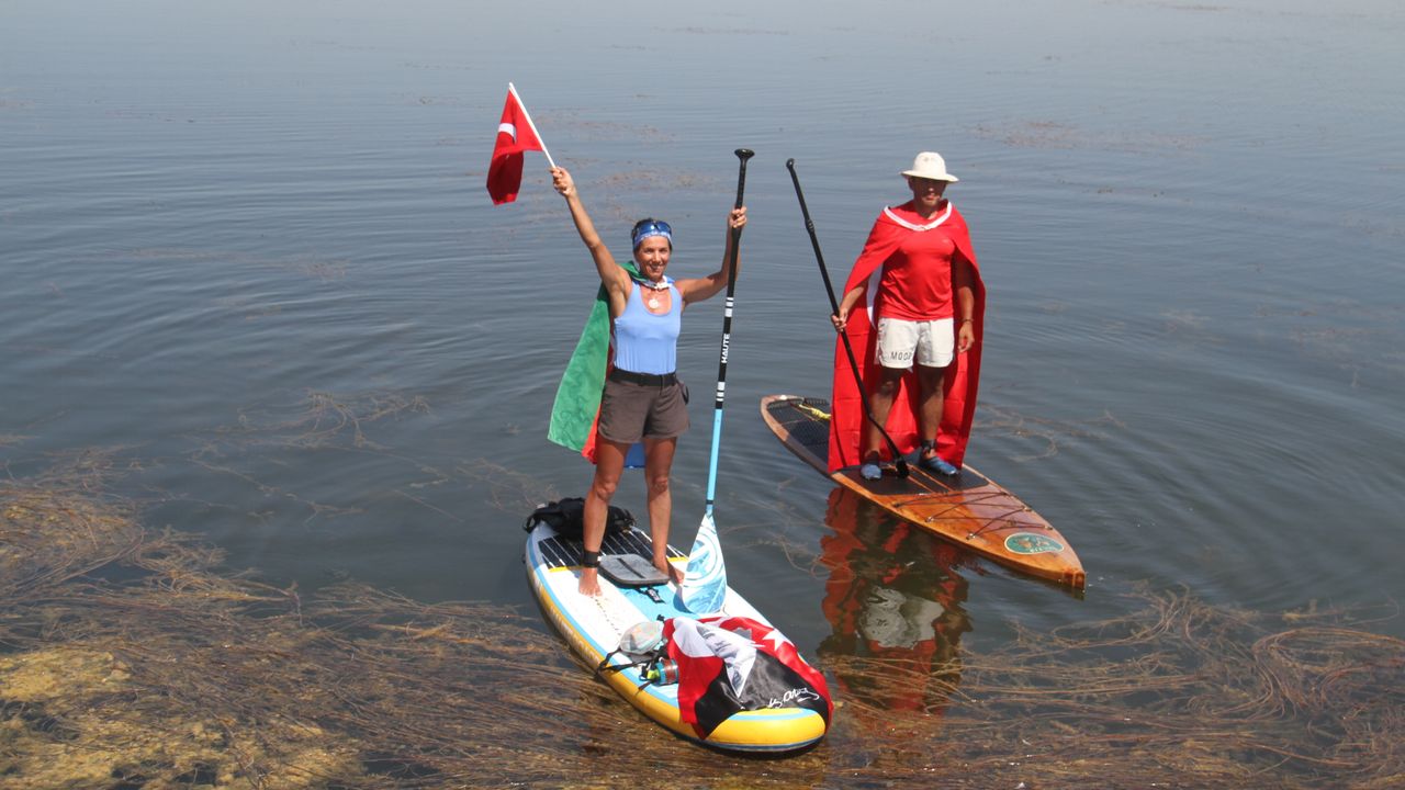 İkili, iki gün süren etkinlik çerçevesinde Beyşehir Gölü'nü bir uçtan bir uca kürek sörfü yaparak geçti.