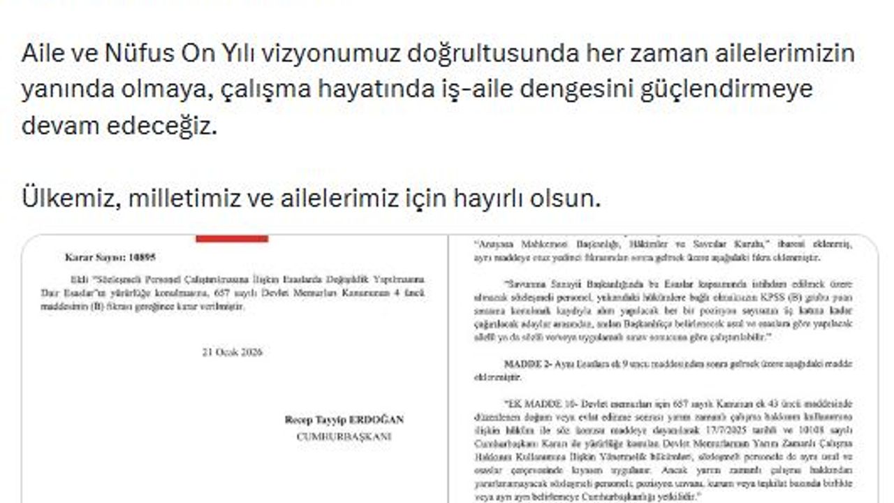 Aile ve Sosyal Hizmetler Bakanı Mahinur Özdemir Göktaş, düzenlemeye ilişkin sanal medya hesabından yaptığı açıklamada, 'Sözleşmeli Personel Çalıştırılmasına İlişkin Esaslar'da yapılan değişiklikle doğum ve evlat edinme sonrası yarım zamanlı çalışma hakkının sözleşmeli personeli de kapsayacağı yönünde düzenleme, Cumhurbaşkanımız Sayın Recep Tayyip Erdoğan'ın imzasıyla Resmi Gazete'de yayımlanarak yürürlüğe girdi. 'Aile ve Nüfus 10 Yılı' vizyonumuz doğrultusunda her zaman ailelerimizin yanında olmaya, çalışma hayatında iş-aile dengesini güçlendirmeye devam edeceğiz. Ülkemiz, milletimiz ve ailelerimiz için hayırlı olsun' dedi. (DHA)