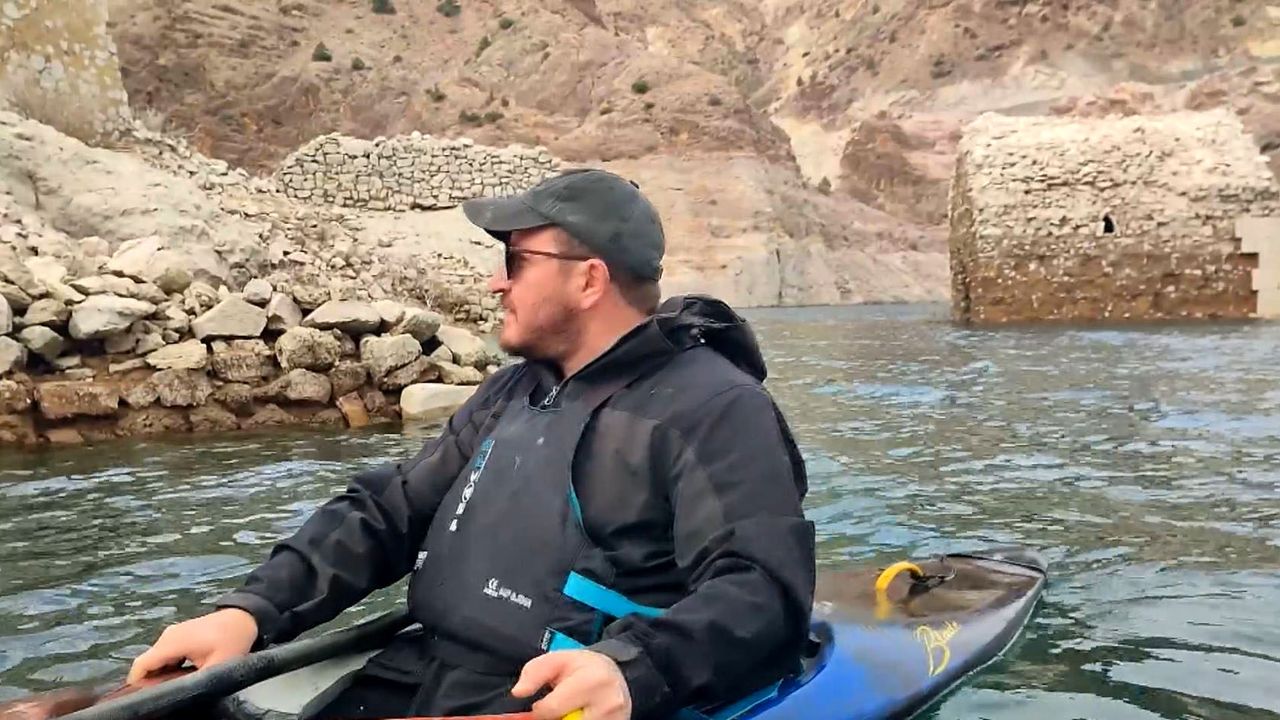 Yusufeli ilçesinde Çoruh Nehri'nin üzerine inşa edilen, 275 metre gövde yüksekliği ile Türkiye'nin en yüksek, dünyanın 5'inci en yüksek barajı Yusufeli Barajı'nda enerji üretimi sürüyor. Baraj inşası sürecinde mahalle halkı yeni inşa edilen yerleşim yerlerine taşınırken, ilçe merkezi ile 7 köy sular altında kaldı. Baraj suyunun, bazı yerlerde çekilmesi ile su altında kalan eski yerleşim yerleri de gün yüzüne çıkıyor. Baraj gölünde kano sporu yapanlar, suyun çekilmesiyle ortaya çıkan sarp kayalar üzerindeki Tekkale Köyü Kalesi'ne kanoyla ulaşıp, tarihte yolculuğa çıkıyor. Suya gömülen eski yerleşim alanlarına dalış yaparak, dipte kalan anıları yad eden profesyonel yüzücü ve kano sporcusu Serhat İnce, bu kez tarihi kaleyi ziyaret etti. İnce, kanoyla pencereden girdiği tarihi kaleyi kamerayla görüntüledi.