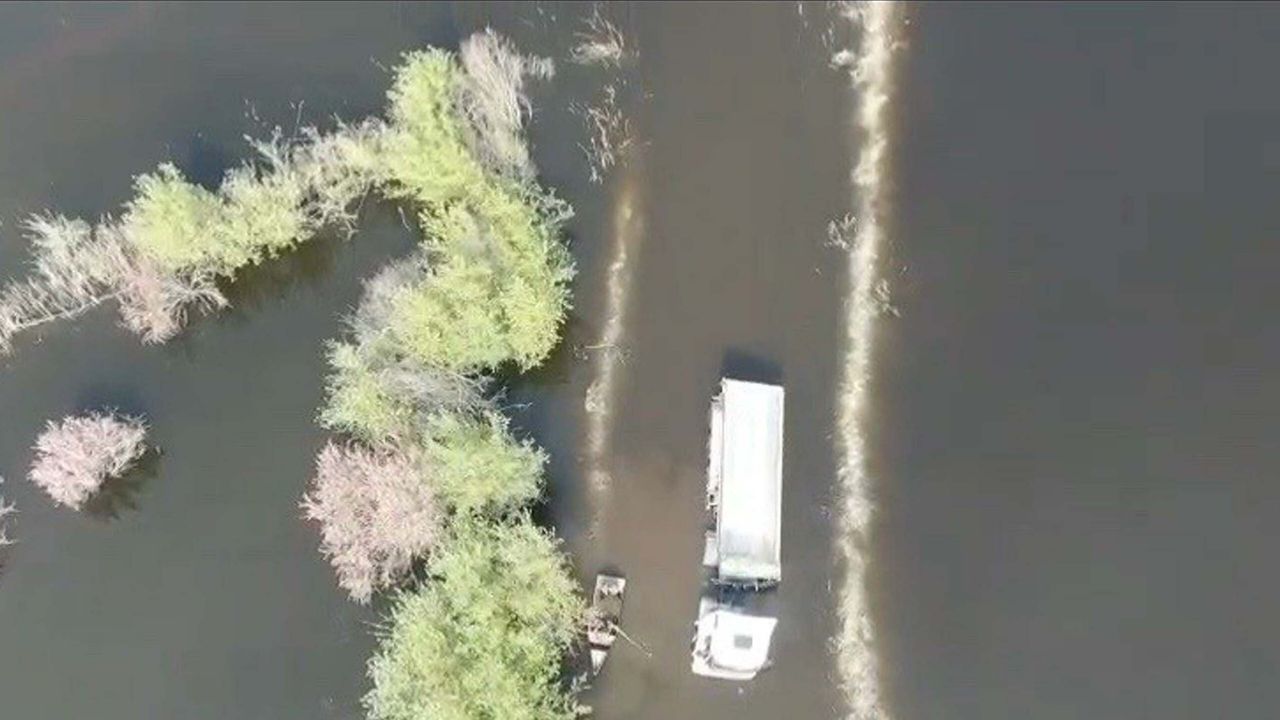 Melek FIRAT/AYDIN, (DHA)-AYDIN'ın Söke ilçesinde taşkın sularının kapladığı tali mahsur kalan TIR şoförünü sandalla ulaşan itfaiye ekipleri kurtardı. Kurtarma anları dronla görüntülendi.