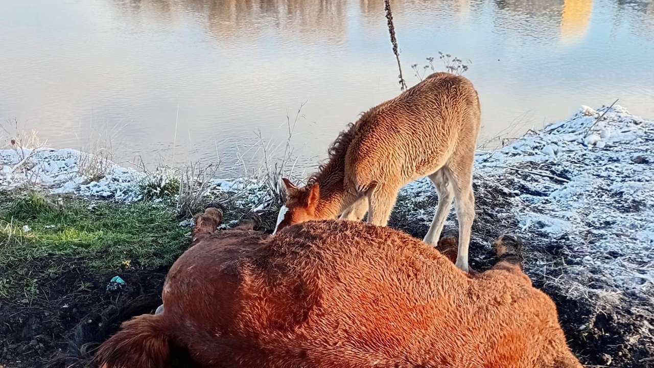 Ardahan Kura Nehri kıyısında ölü bir at yanındaki yavrusuyla görüntülendi. Tayın, annesinin başından ayrılmadığı ve zaman zaman emdiği görülürken, o anlar çevredeki bir kişi tarafından cep telefonuyla kaydedildi. Bir kişi tayı sahiplenerek götürdü. (DHA)