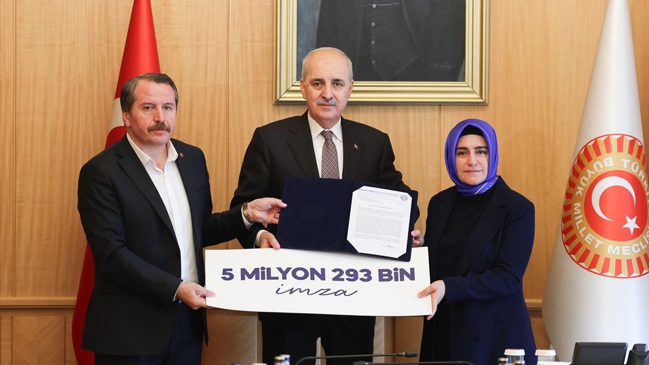 Meclis Başkanlığı Divan Salonu'ndaki kabulde Memur-Sen Genel Başkanı Yalçın ile Memur-Sen Kadınlar Komisyonu Başkanı Sıdıka Aydın, ailenin korunmasına yönelik Anayasa değişikliği talebiyle Memur-Sen tarafından 81 ilde yürütülen "Anayasa Değişsin, Aile Korunsun" imza kampanyası kapsamında 5 milyon 293 bin imzanın bulunduğu dilekçeyi TBMM Başkanı Kurtulmuş'a takdim etti.