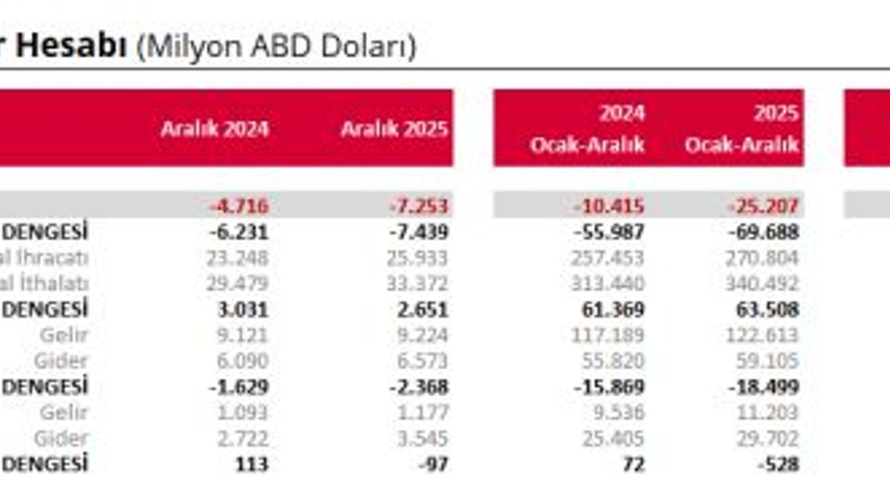 TCMB, Aralık 2025 dönemine ilişkin ödemeler dengesi gelişmelerini açıkladı. Buna göre; aralık ayında cari işlemler hesabı 7 milyar 253 milyon dolar açık kaydetti. Altın ve enerji hariç cari işlemler hesabı 691 milyon dolar açık verdi. Ödemeler dengesi tanımlı dış ticaret açığı 7 milyar 439 milyon dolar olarak gerçekleşti. Yıllıklandırılmış verilere göre; aralık ayında cari açık yaklaşık 25,2 milyar dolar olurken, ödemeler dengesi tanımlı dış ticaret dengesi de 69,7 milyar dolar açık verdi.
