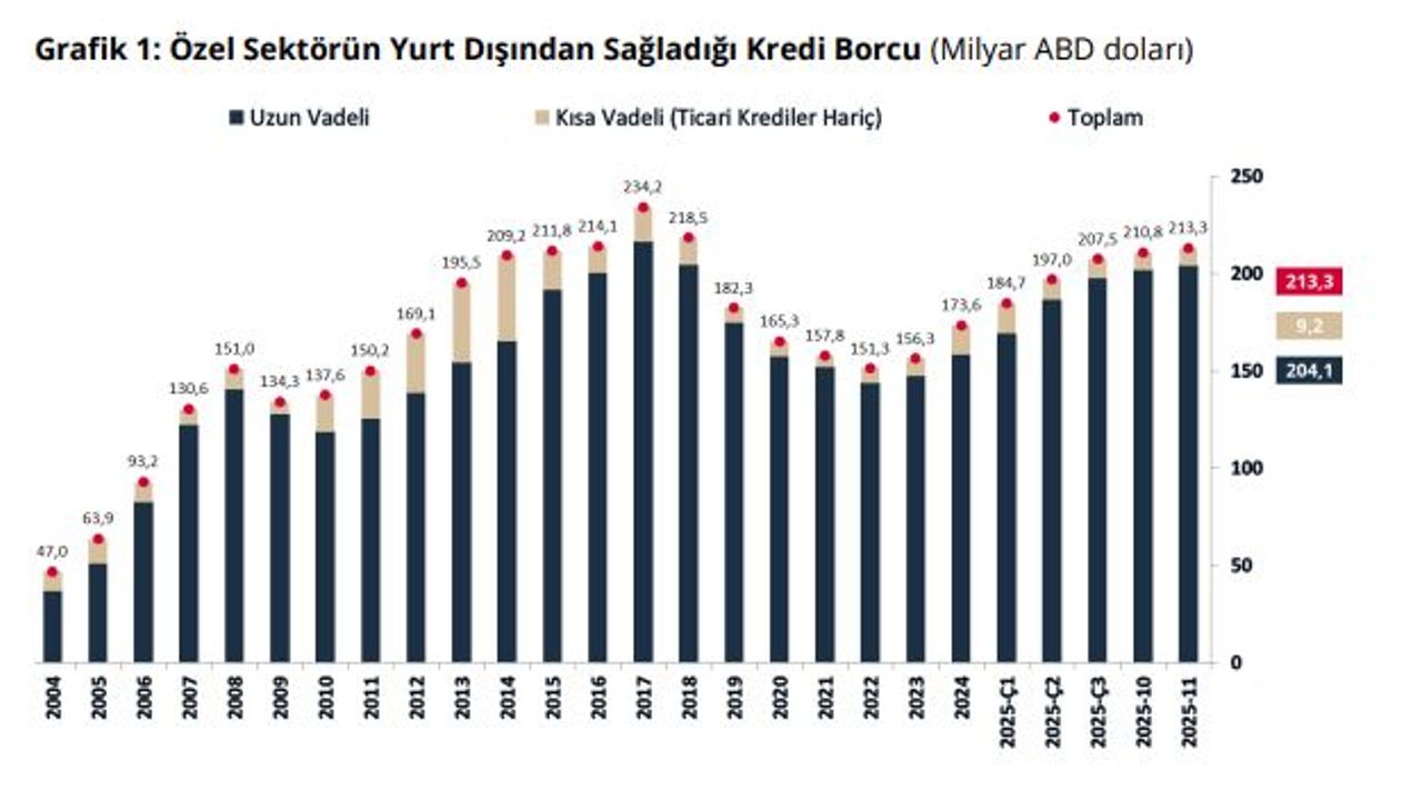 TCMB, Kasım 2025 dönemine ilişkin özel sektörün yurt dışından sağladığı kredi borcu gelişmelerini açıkladı. Buna göre; özel sektörün yurt dışından sağladığı toplam kredi borcu, bir önceki ay sonuna göre 2,4 milyar dolar artarak 213,3 milyar dolar oldu. Vadeye göre incelendiğinde; bir önceki ay sonuna göre, uzun vadeli kredi borcunun 2,2 milyar dolar artarak 204,1 milyar dolar, kısa vadeli kredi borcunun (ticari krediler hariç) 0,2 milyar dolar artarak 9,2 milyar dolar düzeyinde gerçekleştiği gözlendi. Bir önceki ay sonuna göre finansal kuruluşların toplam borcu 1,1 milyar dolar; finansal olmayan kuruluşların toplam borcu 1,3 milyar dolar artış gösterdi. Aynı dönemde finansal kuruluşların uzun vadeli borçları 1,1 milyar dolar, finansal olmayan kuruluşların uzun vadeli borçları 1,1 milyar dolar artış gösterdi. Kısa vadede finansal olmayan kuruluşların borçları 0,2 milyar dolar artış gösterdi.