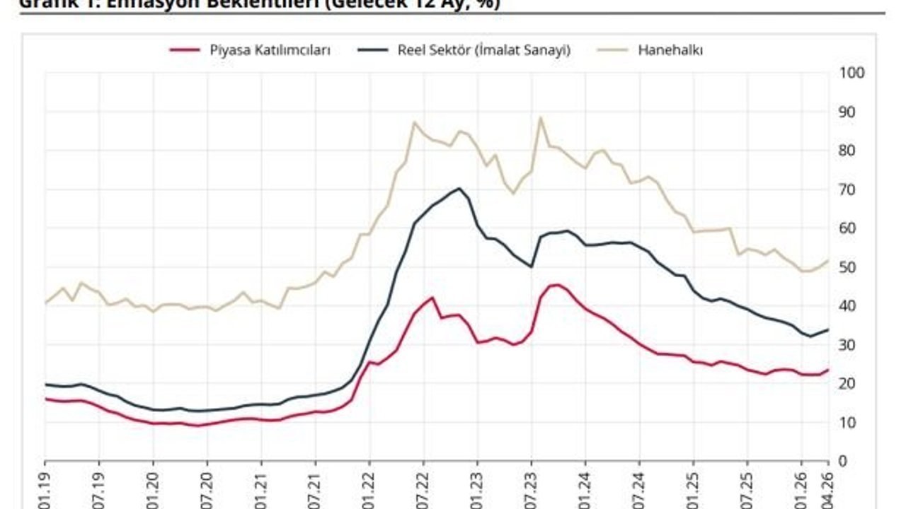 TCMB, Nisan 2026 dönemine ilişkin sektörel enflasyon beklentilerini açıkladı. Buna göre; 12 ay sonrası yıllık enflasyon beklentileri bir önceki aya göre, piyasa katılımcıları için 1,22 puan artarak yüzde 23,39 seviyesine, reel sektör için 0,80 puan artarak yüzde 33,70 seviyesine, hanehalkı için 1,67 puan artarak yüzde 51,56 seviyesine yükseldi. Gelecek 12 aylık dönemde enflasyonun düşeceğini bekleyen hanehalkı oranı bir önceki aya göre 0,57 puan azalarak yüzde 14,57 seviyesinde gerçekleşti. (DHA)