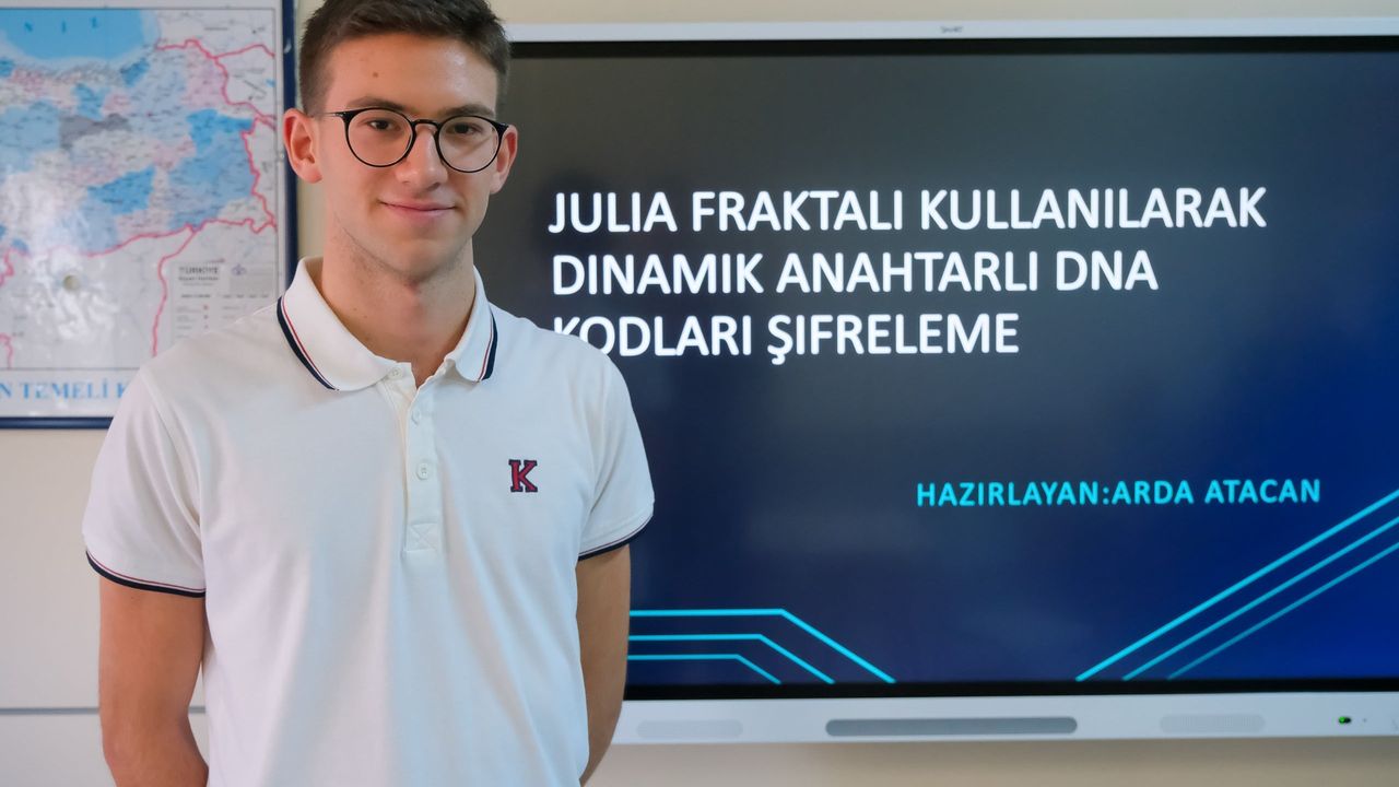 ANKARA, (DHA)- BU yıl 57'ncisi düzenlenen TÜBİTAK Lise Öğrencileri Araştırma Projeleri Yarışması Bölge Sergisi'ne 'Julia Fraktalı Kullanılarak Dinamik Anahtarlı DNA Kodları Şifreleme' başlıklı projesiyle katılan TED Ankara Koleji Özel Lisesi 11'inci sınıf öğrencisi Arda Atacan, matematik dalında bölge birincisi oldu.