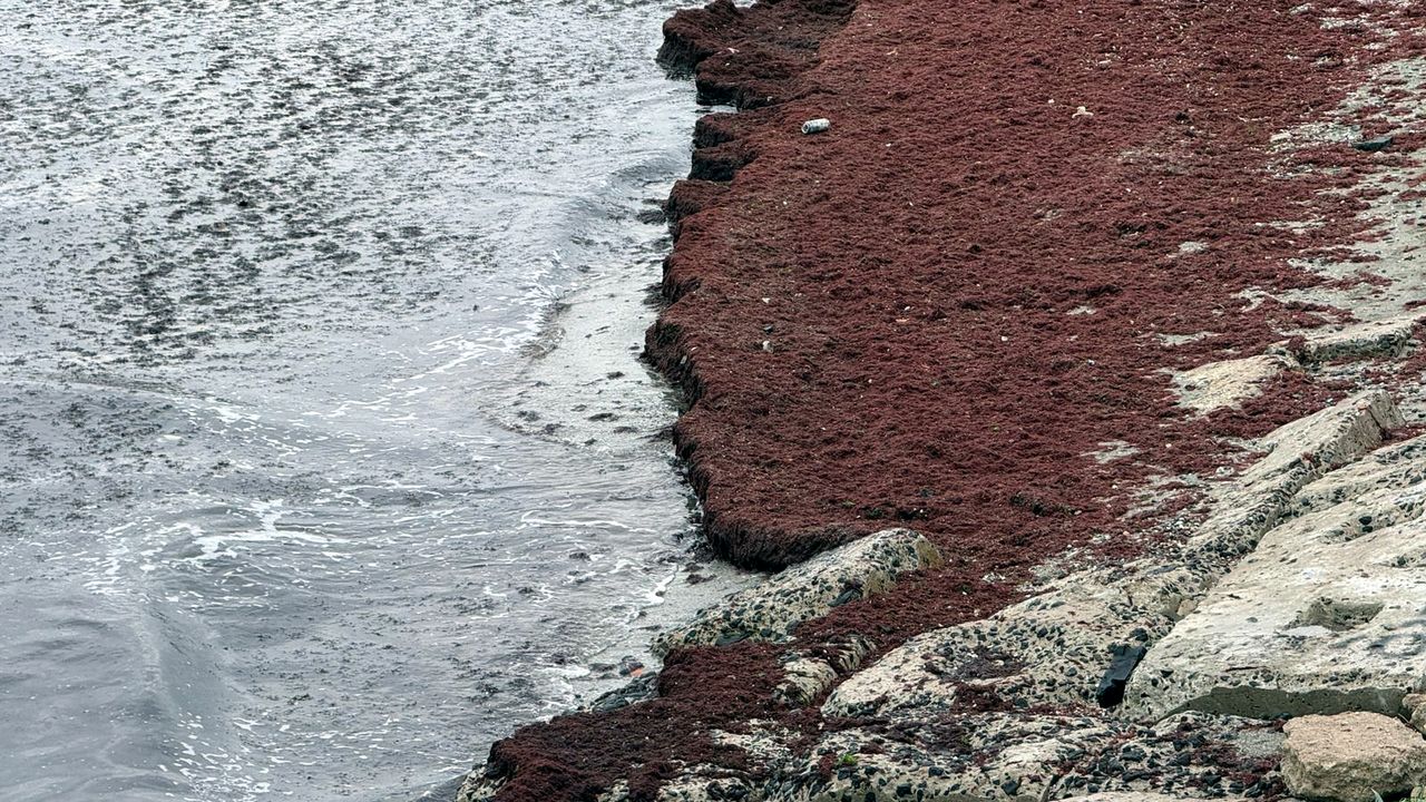Abdullah YALÇIN/TEKİRDAĞ, (DHA)- TEKİRDAĞ'da etkili olan poyraz nedeniyle deniz kıyıları, kırmızı yosunlarla kaplandı.