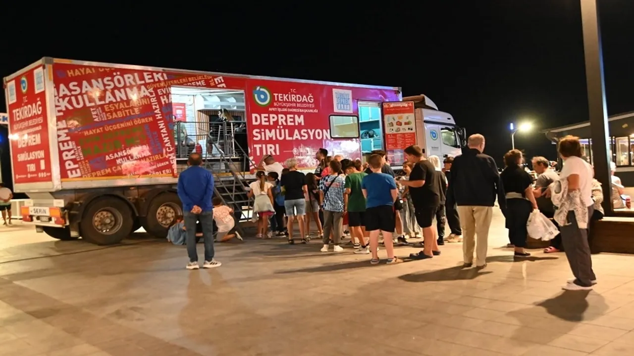 Tekirdağ Büyükşehir Belediyesi, vatandaşların deprem bilincini artırmak amacıyla Afet İşleri Dairesi Başkanlığı bünyesinde hizmet veren deprem simülasyon TIR'ıyla eğitim seferberliği başlattı.TEKİRDAĞ (İGFA) - Etkinlik, 9 Ağustos 1912’de meydana gelen büyük Mürefte Depremi ve 17 Ağustos 1999 Marmara Depremi anma programı kapsamında düzenleniyor.