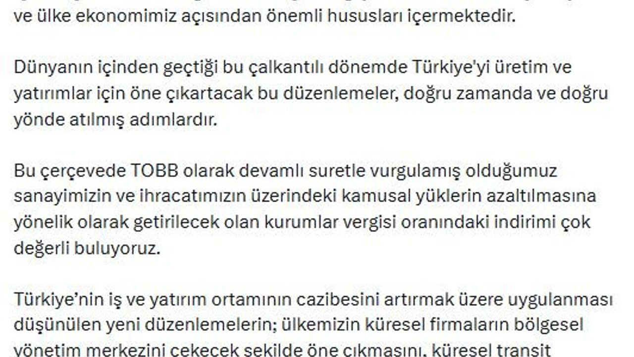 TOBB Başkanı Rifat Hisarcıklıoğlu, 'Türkiye Yüzyılı Yatırım İçin Güçlü Merkez Programı'nda Cumhurbaşkanı Recep Tayyip Erdoğan'ın açıkladığı düzenlemelere ilişkin sanal medya hesabından açıklama yaptı. Hisarcıklıoğlu, 'Cumhurbaşkanımız Sayın Recep Tayyip Erdoğan'ın 'Türkiye Yüzyılı Yatırım İçin Güçlü Merkez Programı'nda açıkladığı yeni düzenlemeler iş dünyamız ve ülke ekonomimiz açısından önemli hususları içermektedir. Dünyanın içinden geçtiği bu çalkantılı dönemde Türkiye'yi üretim ve yatırımlar için öne çıkartacak bu düzenlemeler, doğru zamanda ve doğru yönde atılmış adımlardır. Bu çerçevede TOBB olarak devamlı suretle vurgulamış olduğumuz sanayimizin ve ihracatımızın üzerindeki kamusal yüklerin azaltılmasına yönelik olarak getirilecek olan kurumlar vergisi oranındaki indirimi çok değerli buluyoruz. Türkiye'nin iş ve yatırım ortamının cazibesini artırmak üzere uygulanması düşünülen yeni düzenlemelerin; ülkemizin küresel firmaların bölgesel yönetim merkezini çekecek şekilde öne çıkmasını, küresel transit ticaretten daha fazla pay almasını, girişimcilik ekosisteminin daha hızlı büyümesine destek vermesini ve İstanbul Finans Merkezi'nin dünyanın önde gelen finans merkezlerinden biri haline getirme noktasında daha güçlü bir şekilde konumlanmasını sağlayacağına inanıyoruz. Yine önemini hep dile getirdiğimiz, yatırım süreçlerinin ve bürokrasinin azaltılması ve sadeleştirilmesi yönündeki talebimizin de karşılık bulmasından büyük memnuniyet duyuyoruz. 'Tek Durak Büro' uygulamasıyla çok daha yatırımcı dostu bir yapının kurulmasını bekliyoruz. Küresel ekonomideki riskleri göz ardı etmeden fırsatlara odaklanır ve bunları değerlendirebilirsek buradan yeni bir atılım süreci başlatabiliriz. 'Türkiye Yüzyılı' vizyonunu gerçekleştirme yolunda önemli mesafe kat etmiş oluruz' dedi. (DHA)