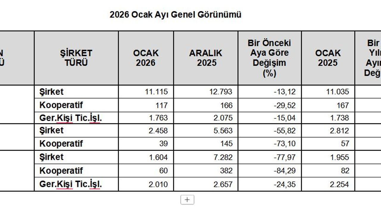 TOBB, Ocak 2026 dönemine ilişkin kurulan ve kapanan şirket istatistiklerini açıkladı. Buna göre; bir önceki aya göre kurulan şirket sayısı yüzde 13,1; kurulan kooperatif sayısı yüzde 29,5; kurulan gerçek kişi ticari işletme sayısı yüzde 15 oranında azaldı. Bir önceki aya göre kapanan şirket sayısında yüzde 78; kapanan kooperatif sayısında yüzde 84,3; kapanan gerçek kişi ticari işletme sayısında yüzde 24,4 oranında azalış oldu. Ocak 2026'da, Ocak 2025'e göre kurulan şirket sayısı yüzde 0,7; kurulan gerçek kişi ticari işletme sayısı yüzde 1,4 oranında arttı, kurulan kooperatif sayısı yüzde 29,9 azaldı. Ocak 2026'da kapanan şirket sayısı 2025 yılının aynı ayına göre yüzde 18; kapanan gerçek kişi ticari işletme sayısı yüzde 10,8; kapanan kooperatif sayısı yüzde 26,8 oranında azaldı.