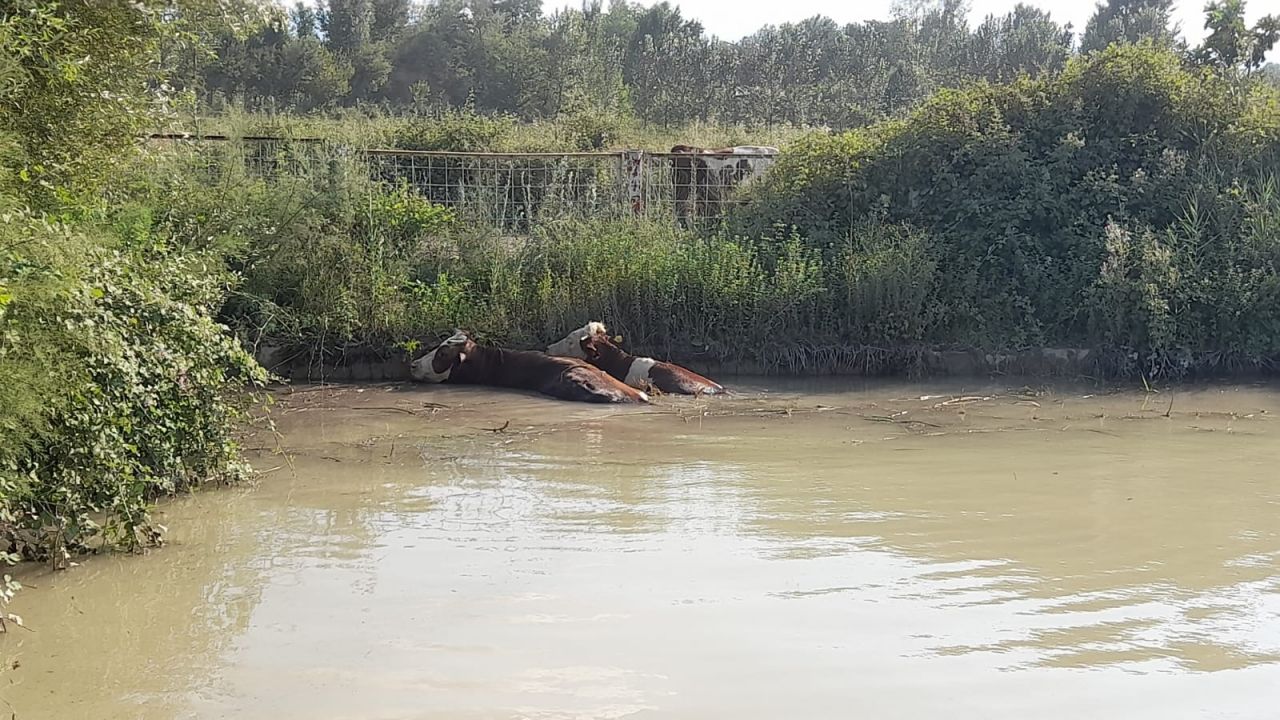 Kelkit Çayı kenarında otlayan ineklerden 3'ü gölete düştü. Hayvanların sahibi Mustafa Yağcı, inekleri kendi imkanlarıyla kurtaramayınca 112 Acil Çağrı Merkezi'nden yardım istedi.